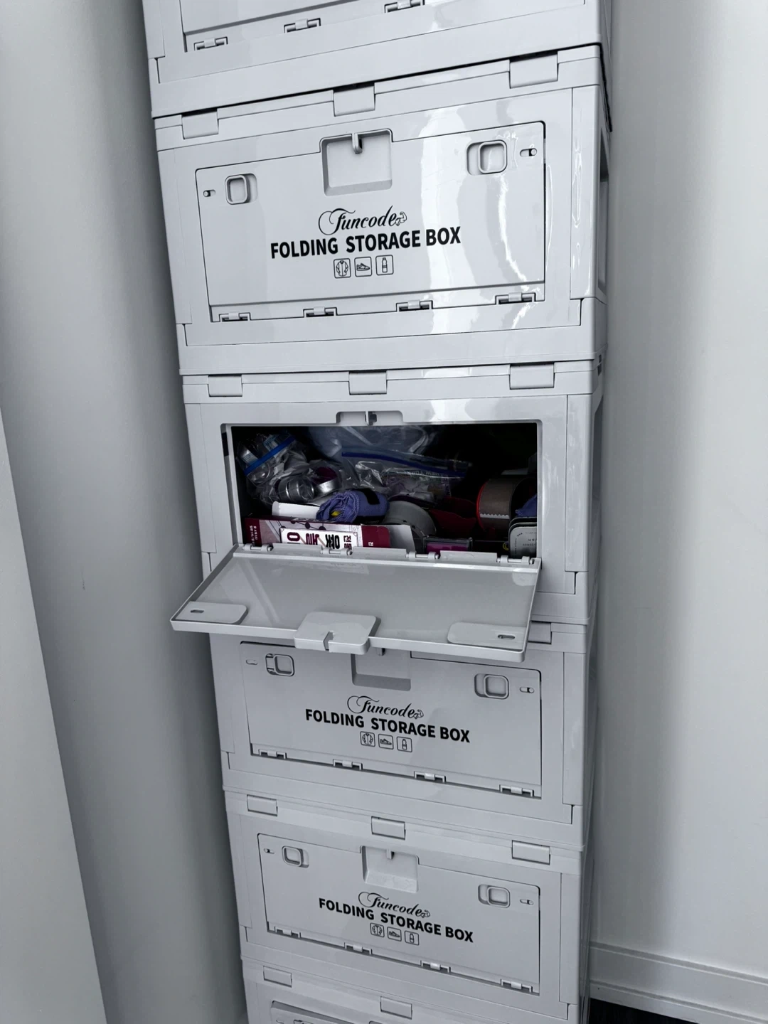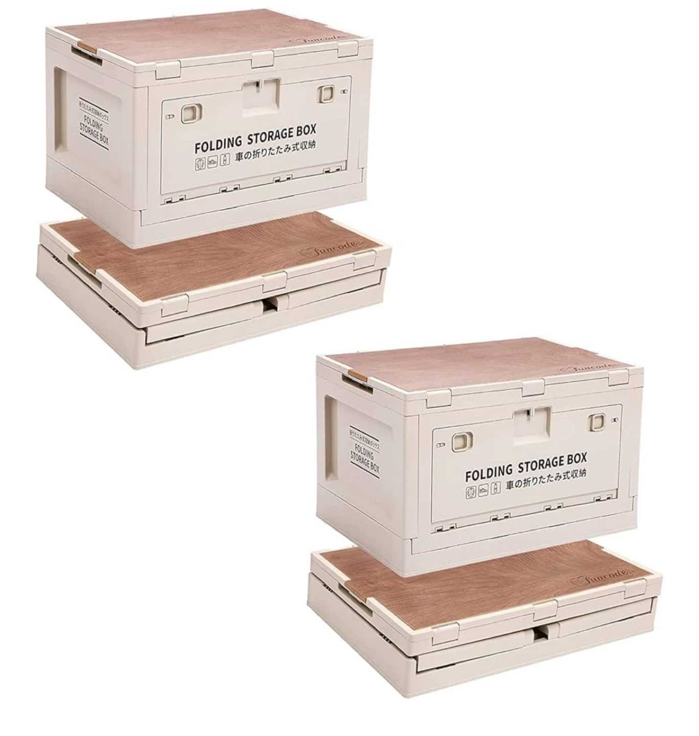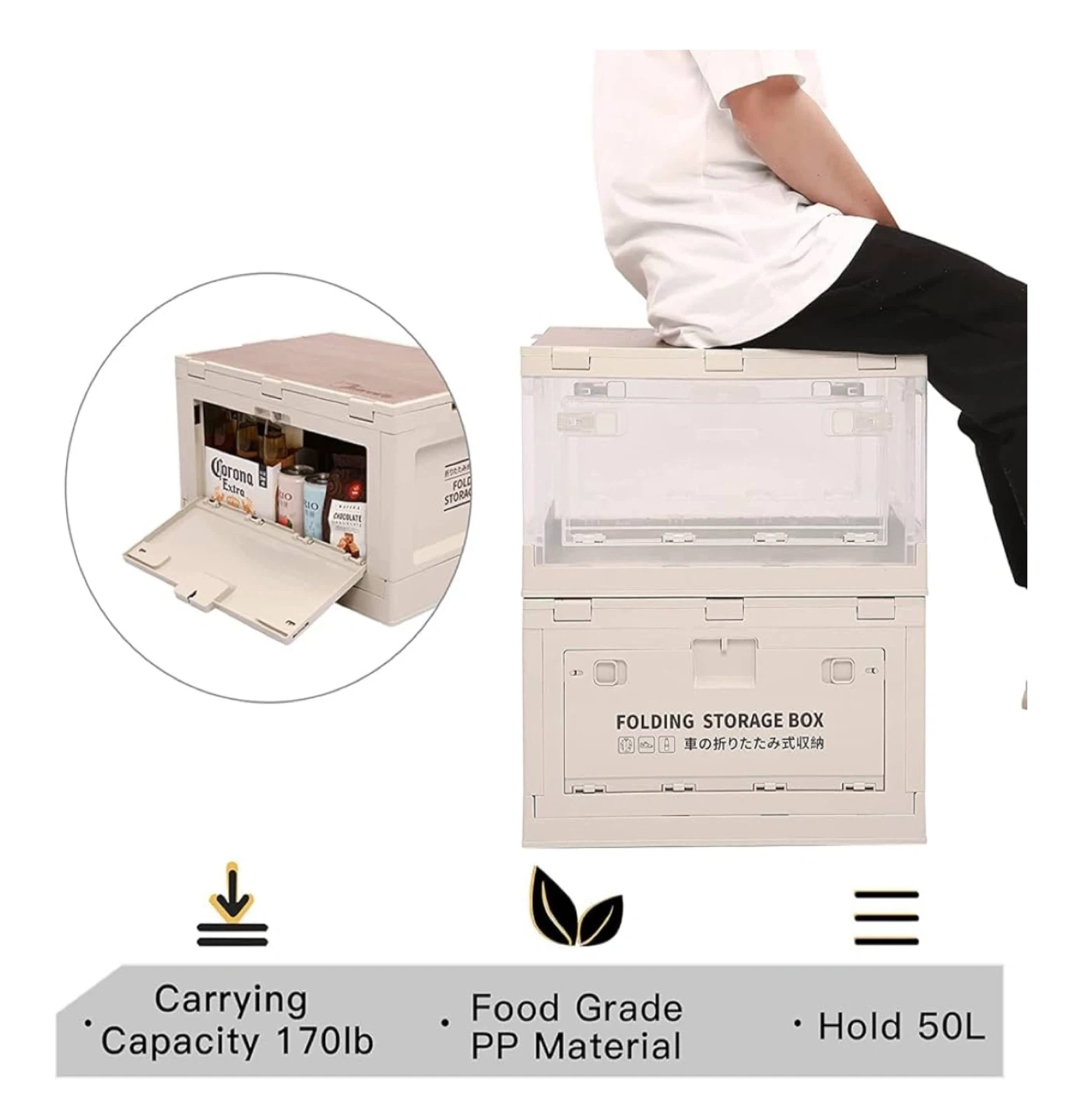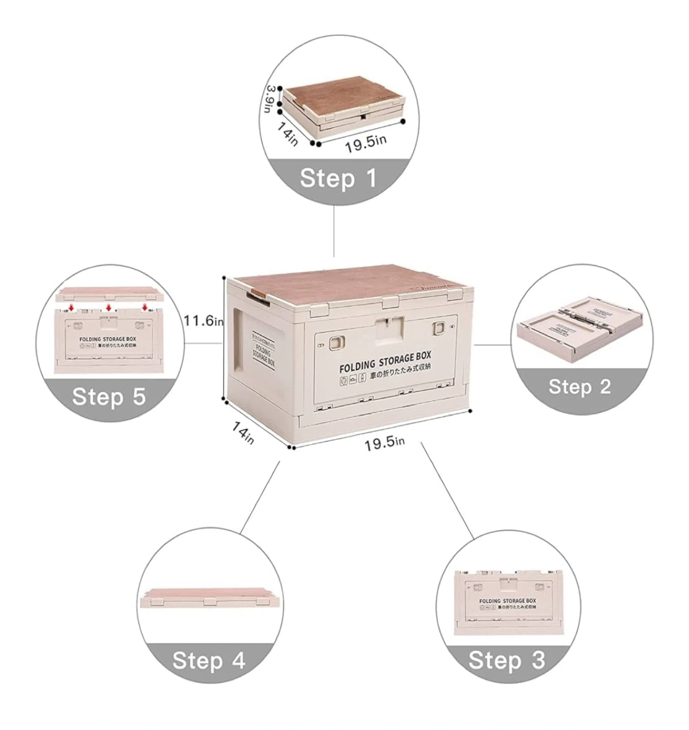5 pcs 3-Way Open-Stack them!: This storage box has a wooden lid and two side doors. You can easily stack several boxes without having any extra work to take out or put in your items. The two side doors also bring you extra convenience to use. Heavy-duty Design: Made of premium PP material which is stable and durable. The upgrade large storage size holds up to 13.7 gallons. The unfolded size is 19.5x14x11.6 inches. Multi-purpose Use-The wood lid and extra thick material that can support weight up to 170lb. USE AS TABLE OR CHAIR, too. Easy Setup & Storage & Clean up No installation needed. Just unfold the cabinet and put the lid on. To store away, fold, and slip into any gap in the house. Folding size 19.5x14x3.9 inch Drop out Free: Both side doors have two lockers. You can easily secure the door and carry the box around full of items. The lockers can also prevent your little one from bringing out anything.