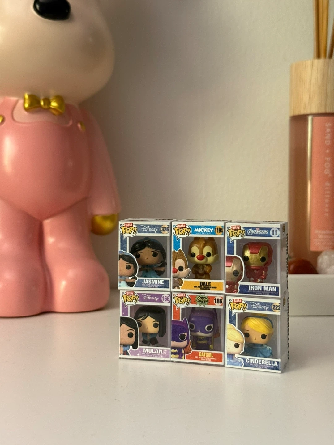 0Selling a set of Funko Bitty Pop! figures featuring characters from Disney and Avengers! You'll get Jasmine, Dale, Iron Man, Mulan, Batgirl, and Cinderella. Great for any collector or fan! 10$ FOR ALL