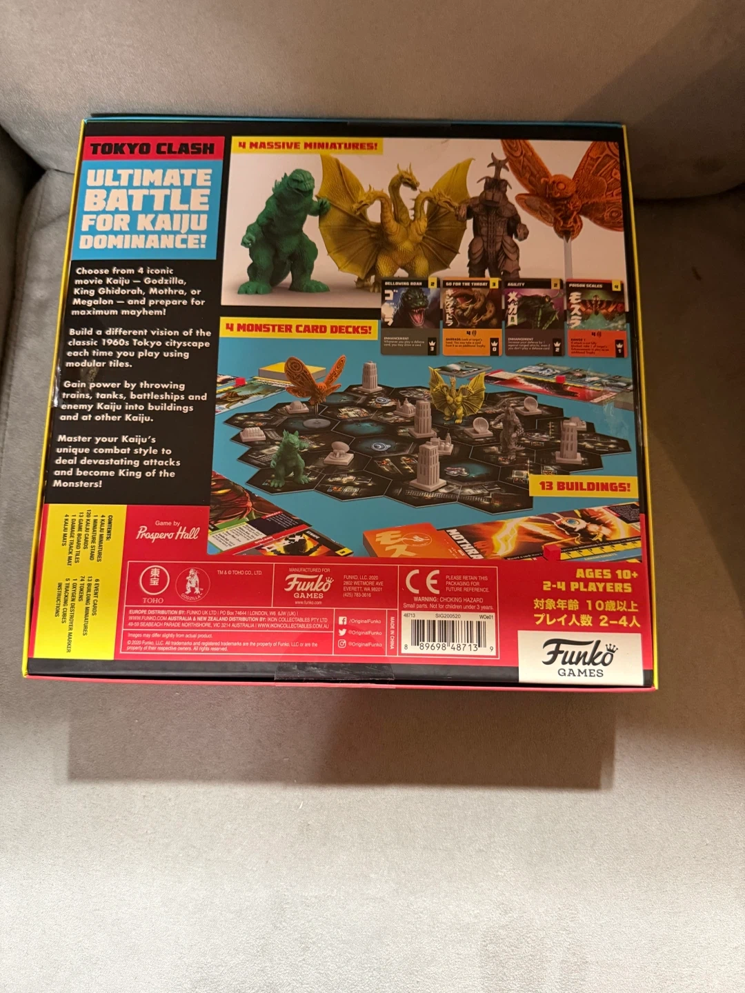 15Selling a Brand New (seal broken on box) Funko Games Godzilla Tokyo Clash strategy game! It's a fun game for 2-4 players, ages 10+. Includes 4 massive miniatures, 4 monster card decks, and 13 buildings. The box and instructions are included! Perfect gift for kids age 10+ Original retail price $24.95 + tax Serious buyer only and no low offers.