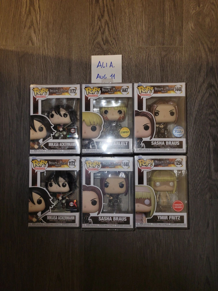 Selling a collection of Funko POP! figures from Attack on Titan. Includes Mikasa Ackerman (1172), Armin Arlelt (1447), Sasha Braus (1448), and Ymir Fritz (1250) Each figure is in its original box