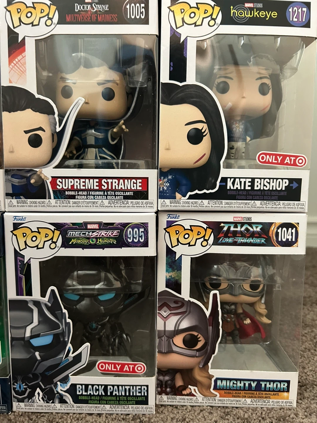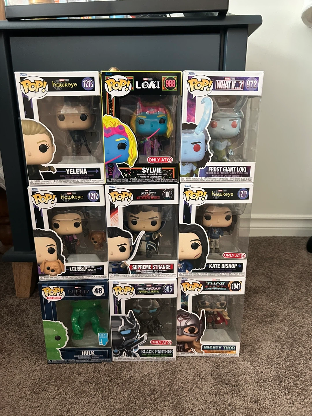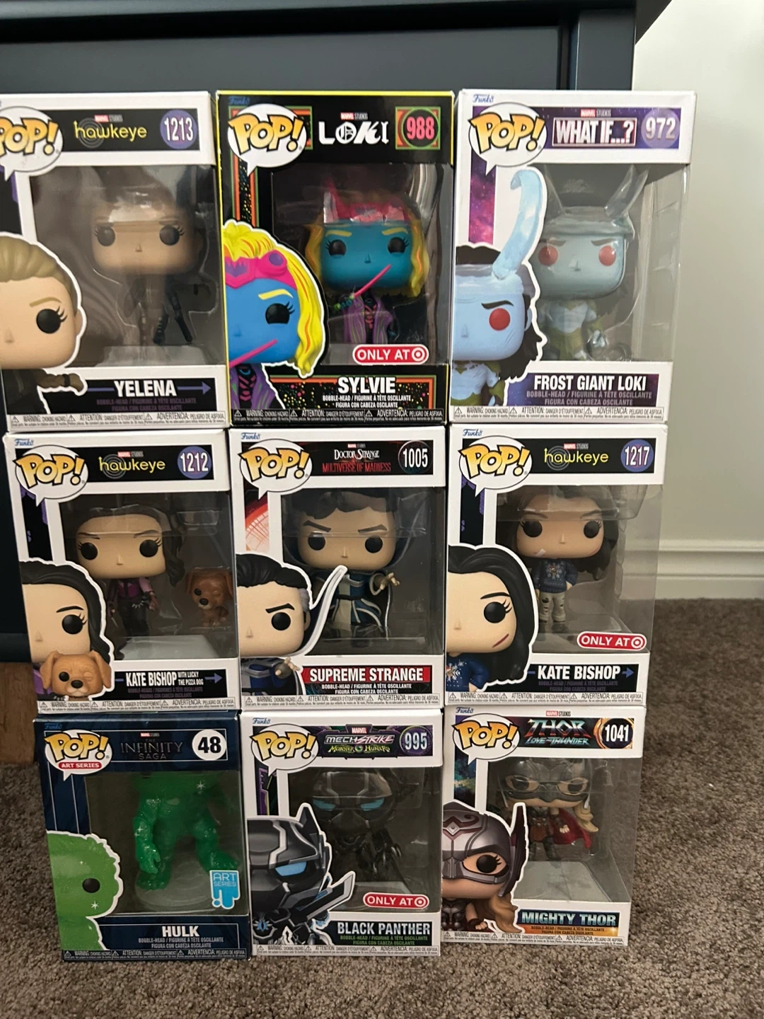 Selling a collection of Funko Pop! Marvel figures. Includes Doctor Strange, Hawkeye (Kate Bishop, Yelena), Black Panther, Thor, Loki, and Hulk. Great for collectors!