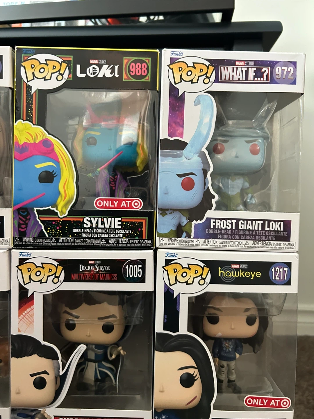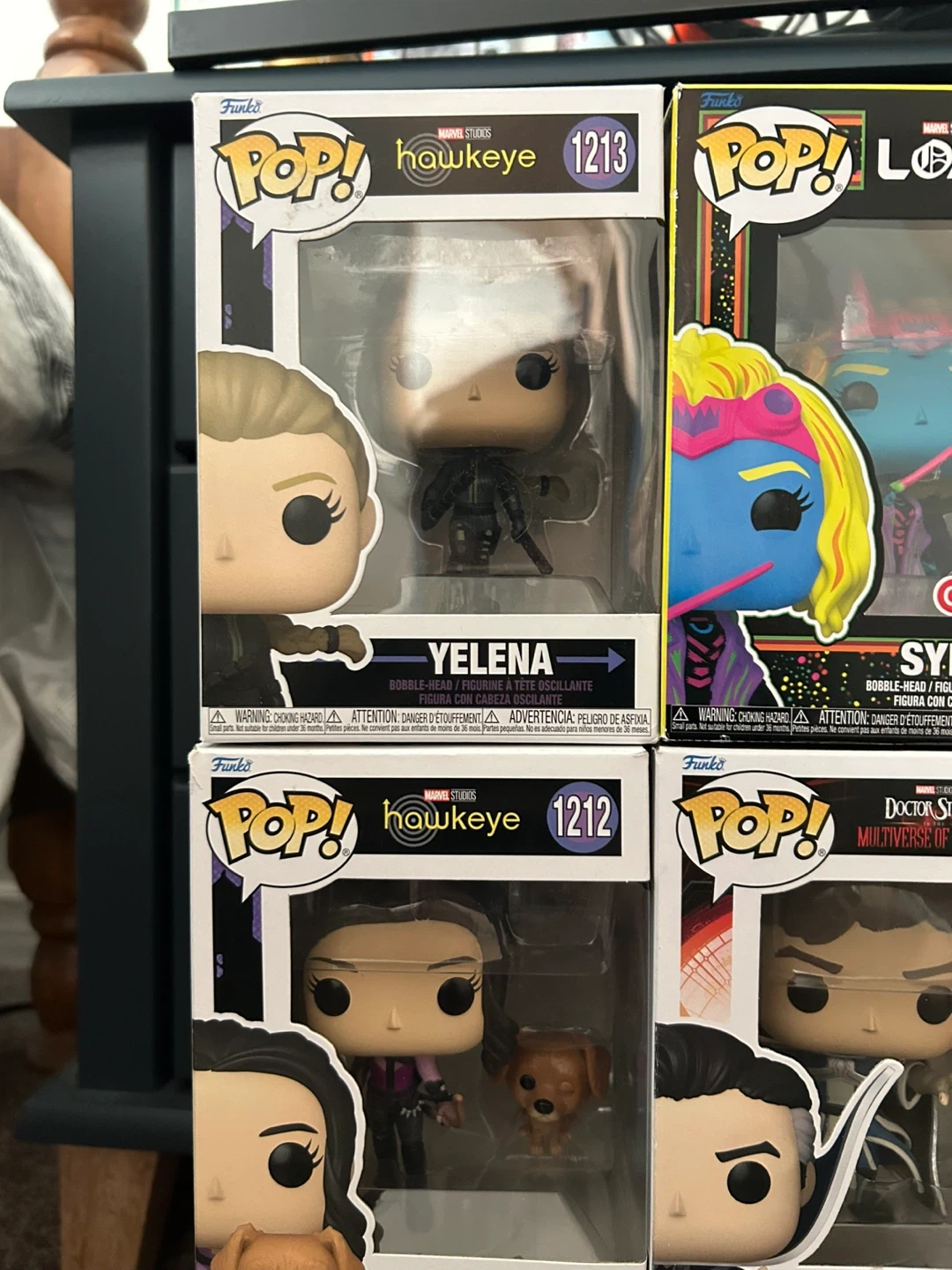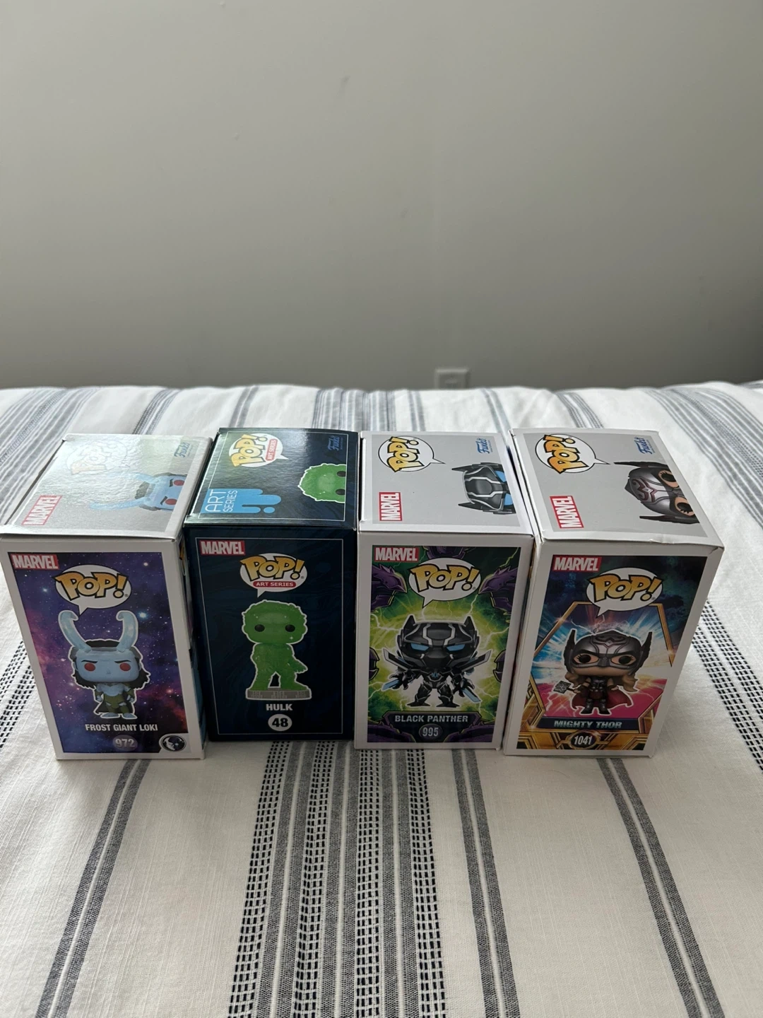 Selling a collection of Funko Pop! Marvel figures. Includes Doctor Strange, Hawkeye (Kate Bishop, Yelena), Black Panther, Thor, Loki, and Hulk. Great for collectors!
