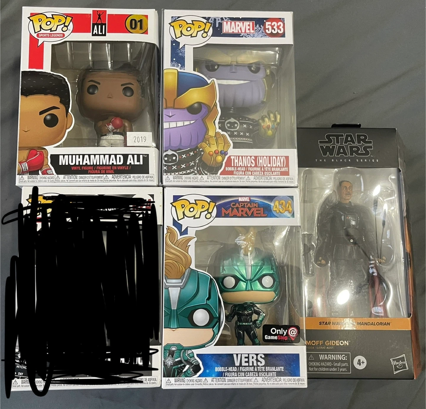 75Selling a collection of Funko Pop! figures, including: - Muhammad Ali (Sports Legends #01) - Thanos (Holiday Marvel #533) - Vers (Captain Marvel #434, GameStop Exclusive) - Moff Gideon (Star Wars The Black Series) All figures are in their original boxes and in great condition! Perfect for collectors or fans! Everything $40 but I willing to sell individual items but prices will vary Pick up only