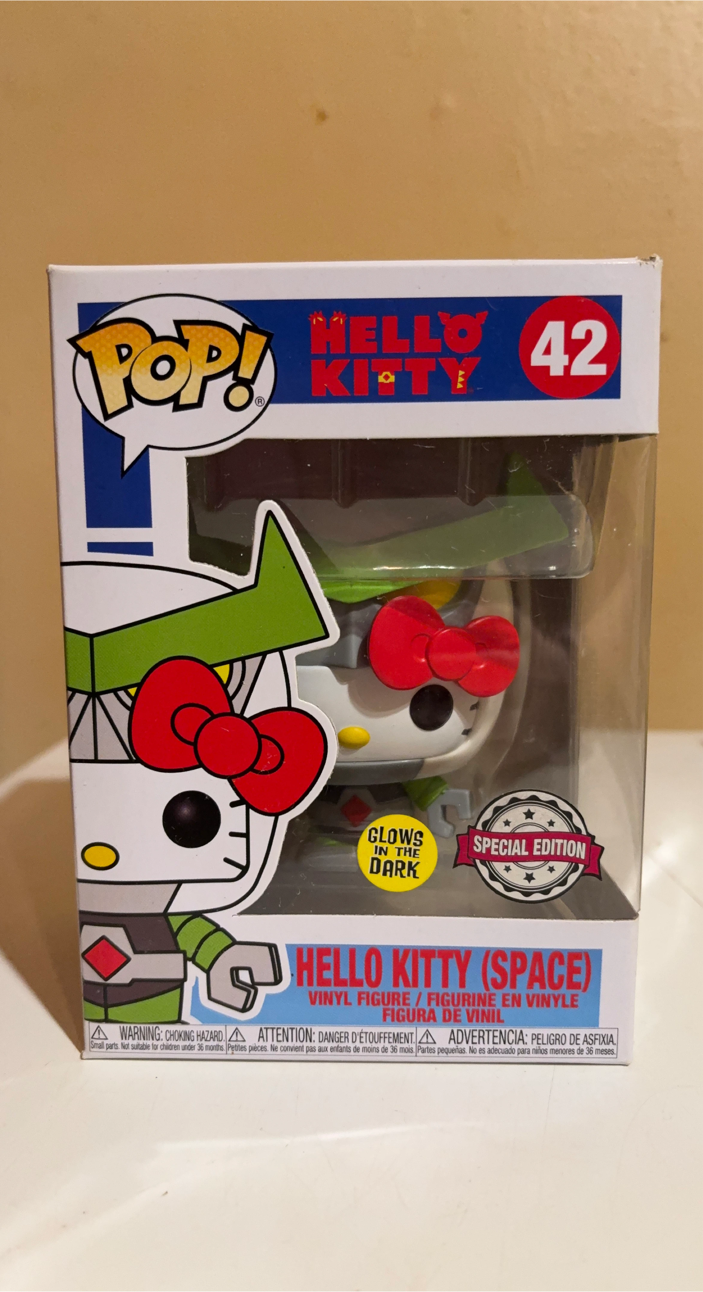 31Selling a Funko Pop! of Hello Kitty in a space-themed design. This is number 42 in the series and is a Special Edition. It even glows in the dark! Perfect for any Hello Kitty or Funko collector *Slight Box Damage ask for photos*