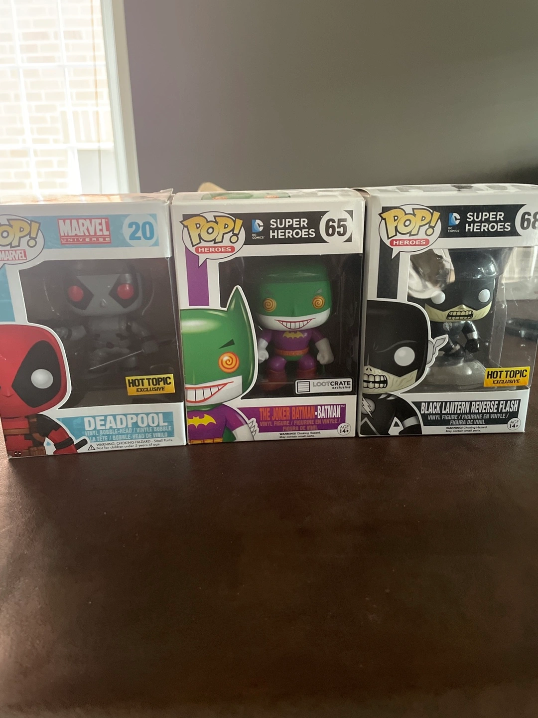 Selling three Funko Pop! figures: - Marvel Universe Deadpool #20 (Hot Topic Exclusive) - DC Super Heroes The Joker Batman-Batman #65 (Lootcrate Exclusive) - DC Super Heroes Black Lantern Reverse Flash #68 (Hot Topic Exclusive) All figures are in their original boxes and are in great condition! Message for individual pricing.