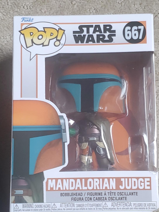 Selling a Funko Pop! Star Wars figure of the Mandalorian Judge, number 667. It's still in its original box and ready for a new home!