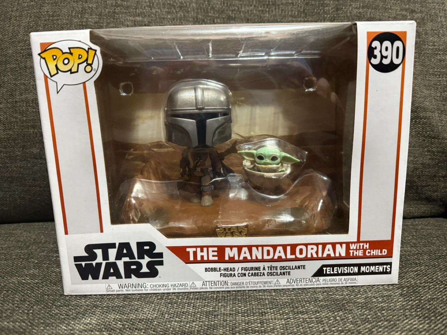 Selling a Funko Pop! from the Star Wars series, featuring The Mandalorian with The Child. This is number 390 in the Television Moments collection. It's a bobble-head figurine and comes in its original box