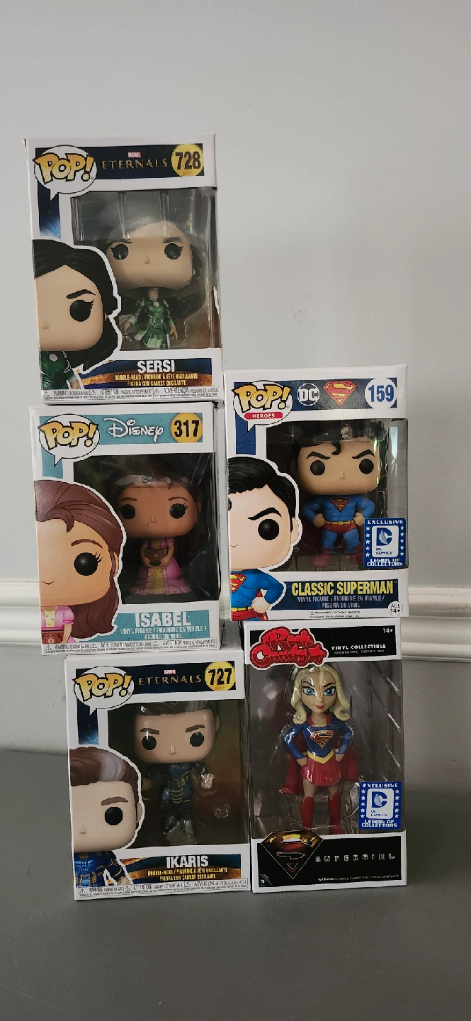 Selling a collection of Funko Pop! vinyl figures. Includes characters from Marvel's Eternals (Sersi and Ikaris), Disney (Isabel), and DC Comics (Classic Superman and Supergirl). Perfect for collectors! $10 each or all for $40