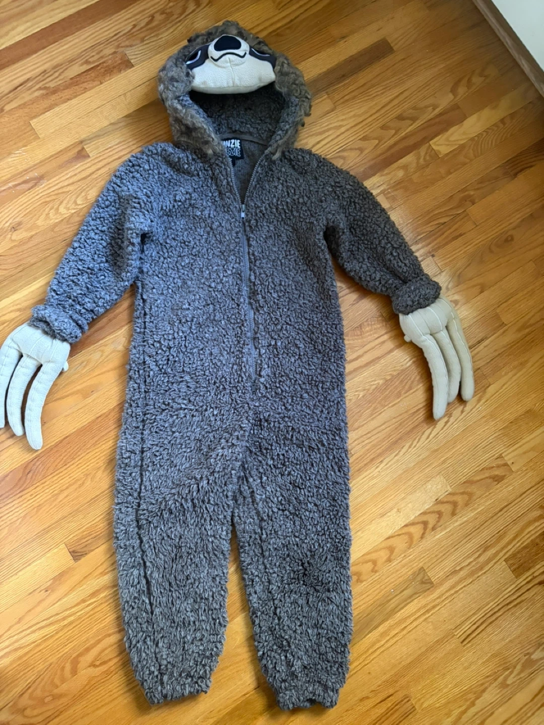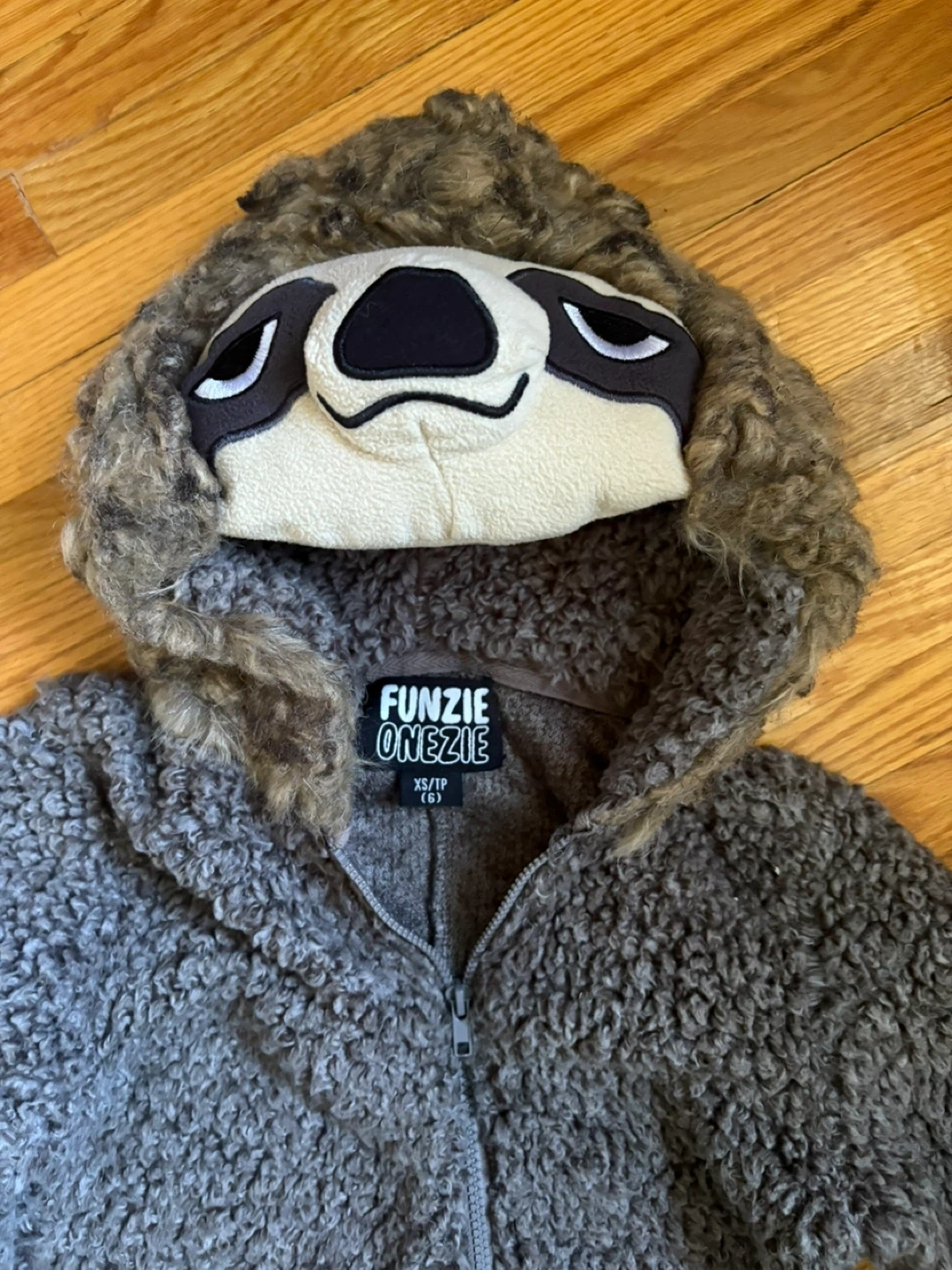 5Selling a Funzie Onezie sloth costume in size XS/1P (6)! It's a super cute and cozy one-piece with a sloth hood and attached gloves. Perfect for dress-up or lounging around the house. The material is soft and fuzzy, making it extra comfy!