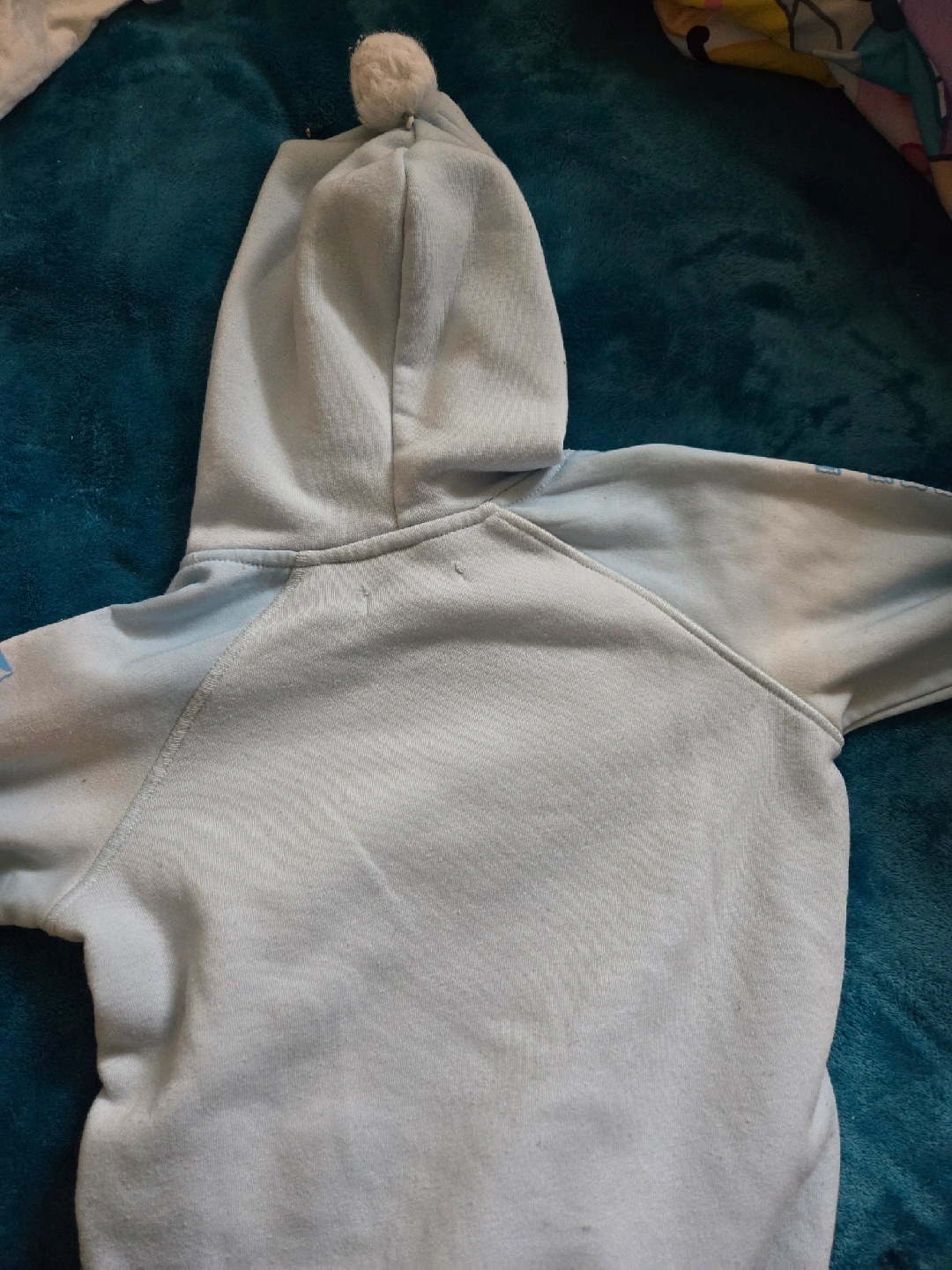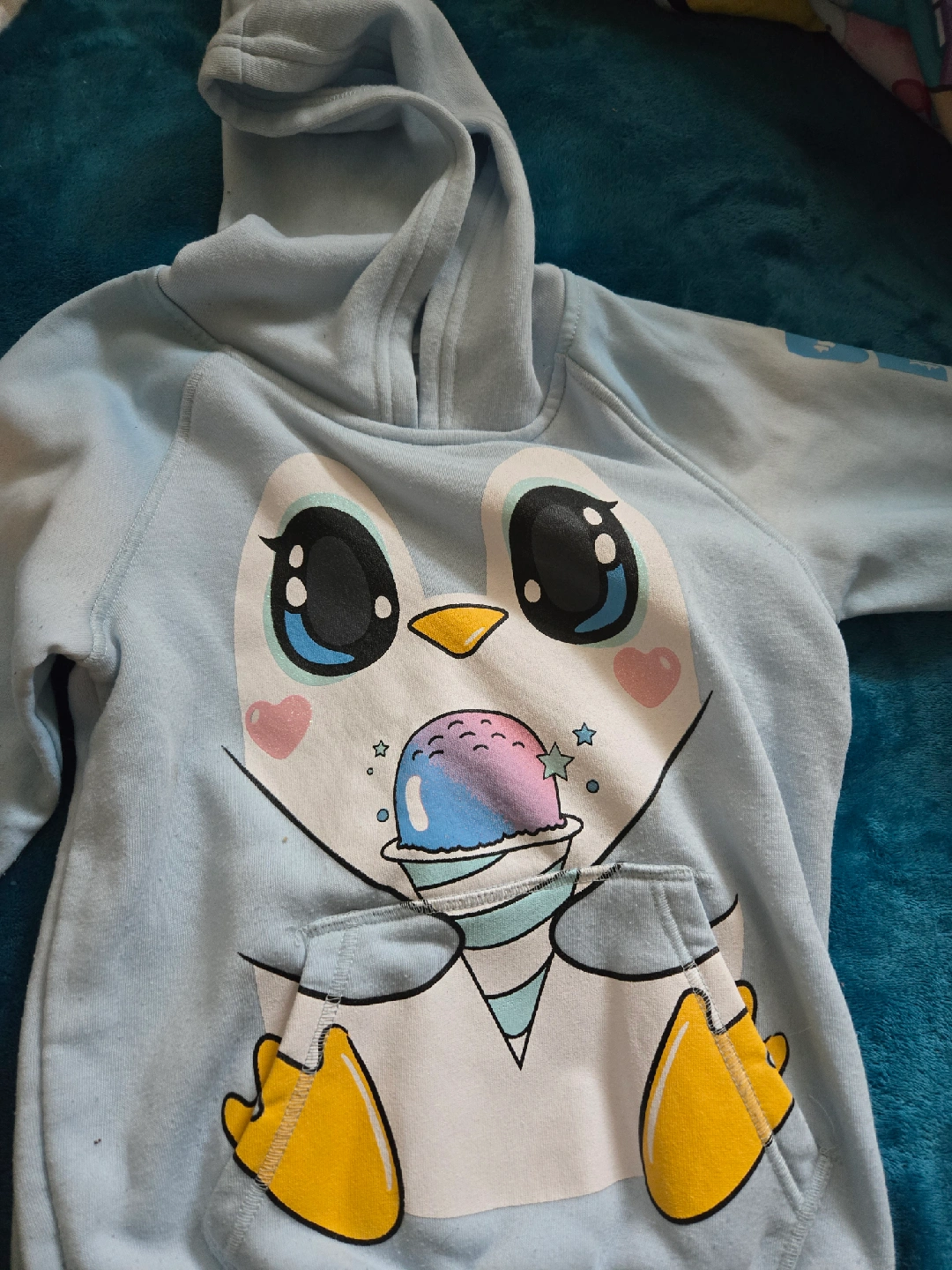 65A cute light blue Funzie Time hoodie for kids! The size is S, which is equivalent to a kids size 7/8. It features a fun penguin design on the front with a snow cone. Perfect for keeping your little one warm and stylish!