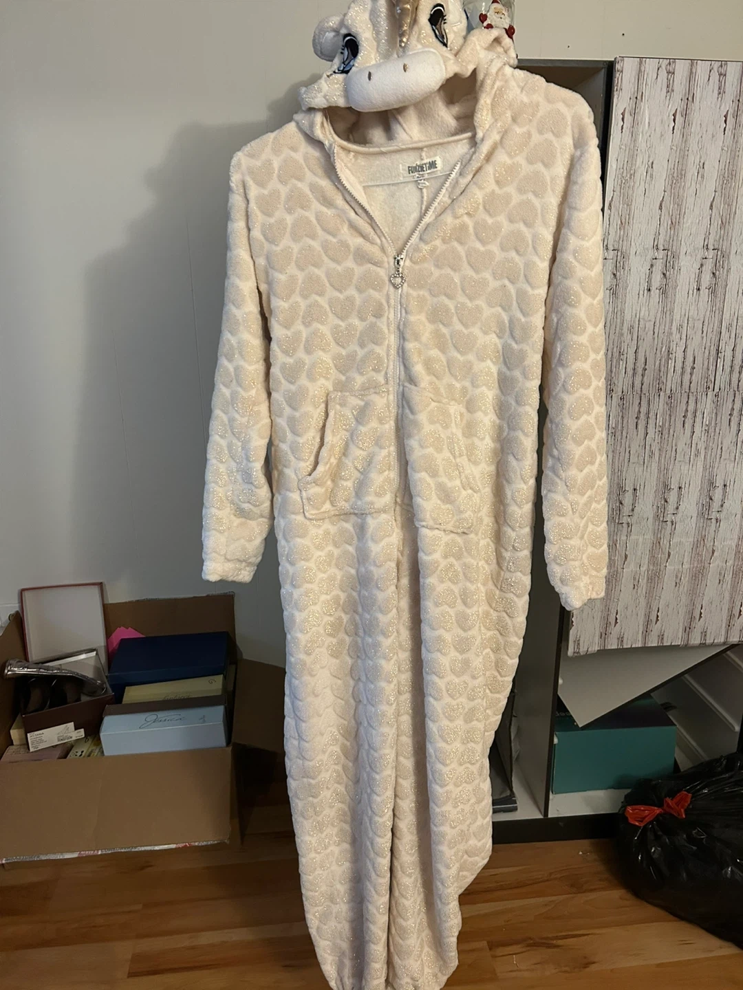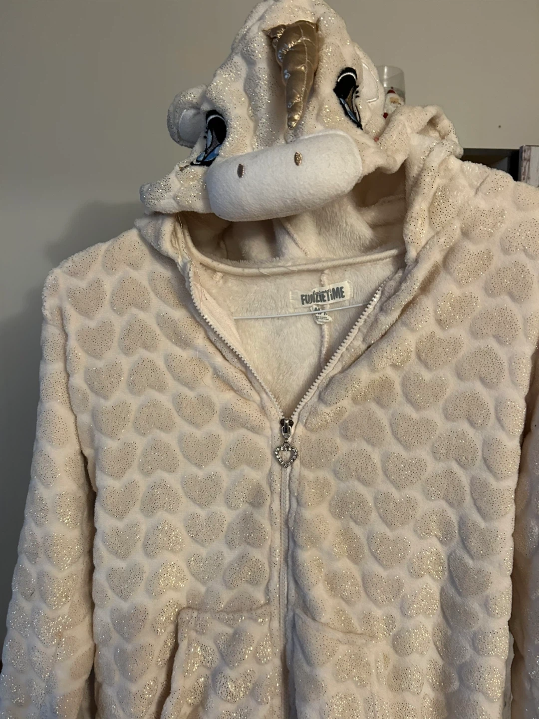 Cozy up in this adorable Funzieztime unicorn onesie! It's a size large and features a cute unicorn hood and a heart pattern all over. Perfect for lounging around the house or adding some fun to your next pajama party