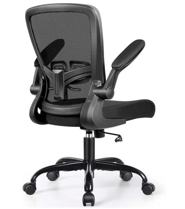 Minlove ergonomic office chair. Features adjustable lumbar support and height, 90° flip-up armrests for easy storage under desks, and a breathable mesh back. The seat cushion is thick and comfortable, suitable for extended use. Smooth 360° swivel wheels. Max weight capacity is 300 lbs. Easy to assemble in about 15 minutes with included tools and manual. Feel free to message if you have any questions!