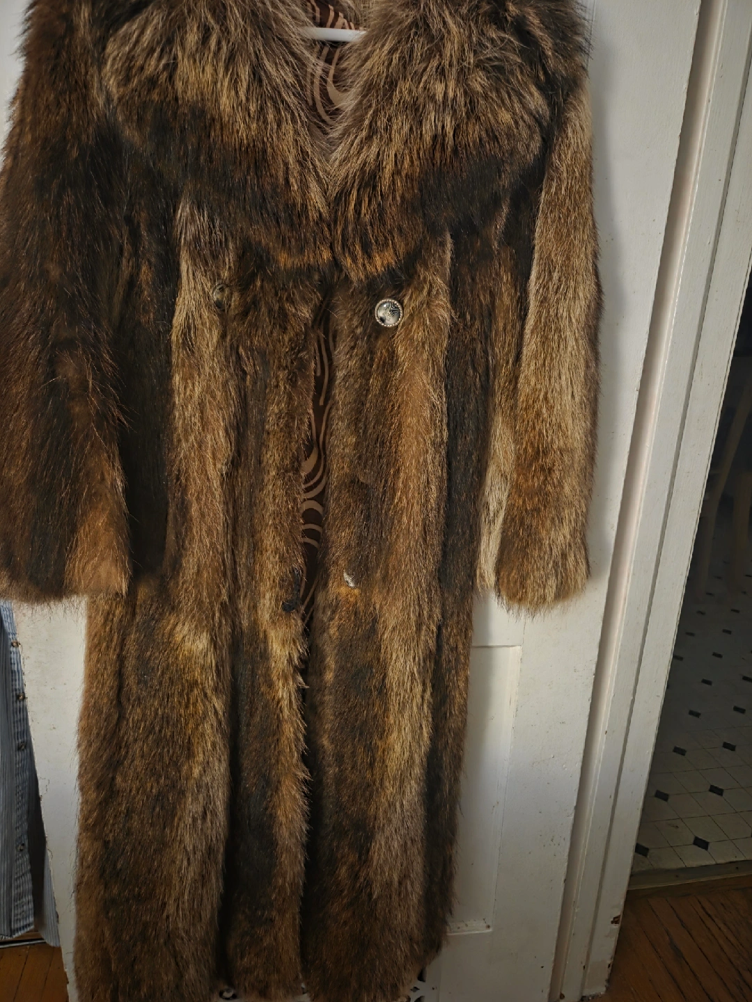 78Selling a fur coat in brown. It has a unique pattern on the inside lining. Perfect for keeping warm during the cold Canadian winters!