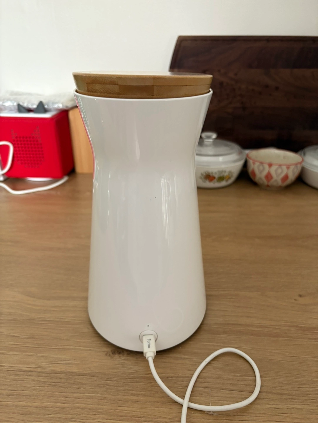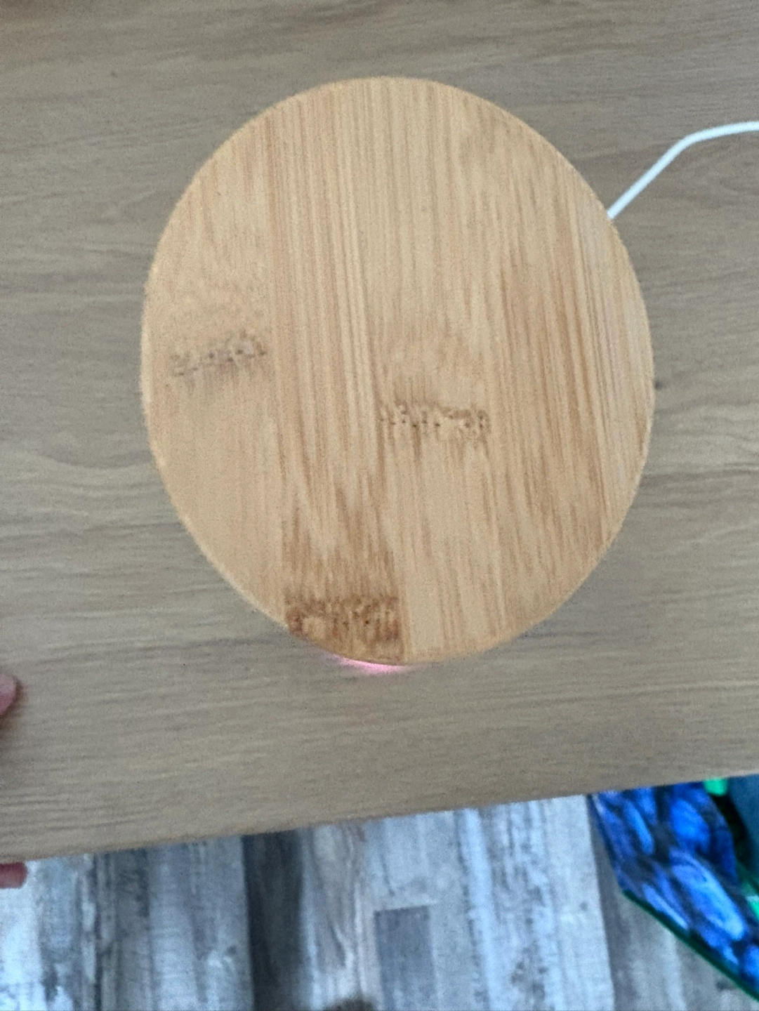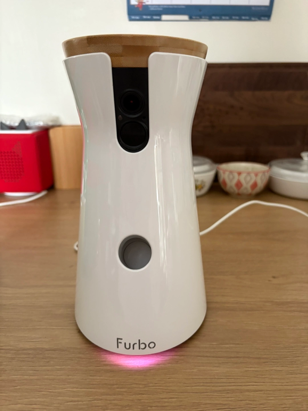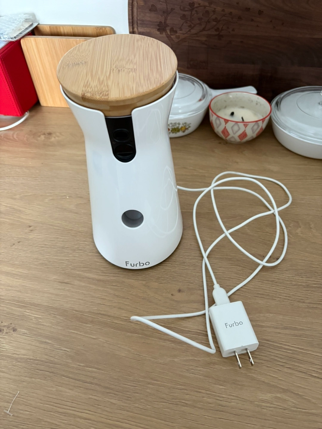 22Smart dog camera. White with bamboo top. Includes power cord. Great for monitoring pets. Good used condition