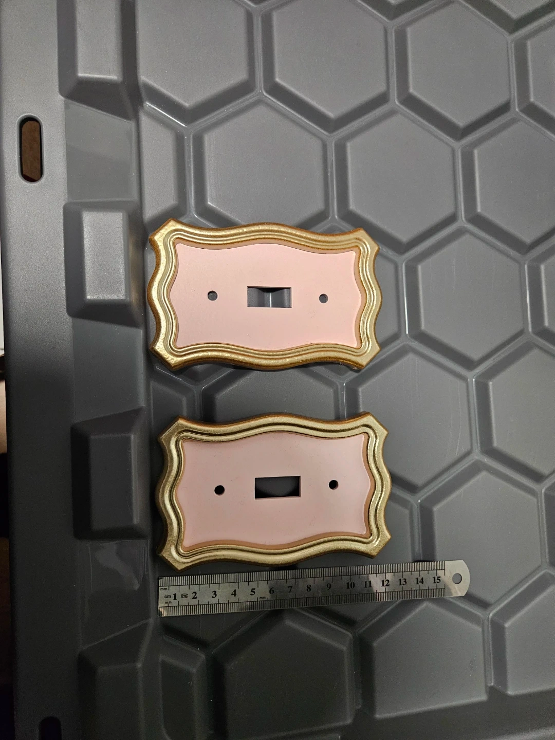 Selling two decorative light switch covers. They feature a pink centre with a gold coloured ornate frame. They measure approximately 15cm in length. Add a touch of elegance to your home!