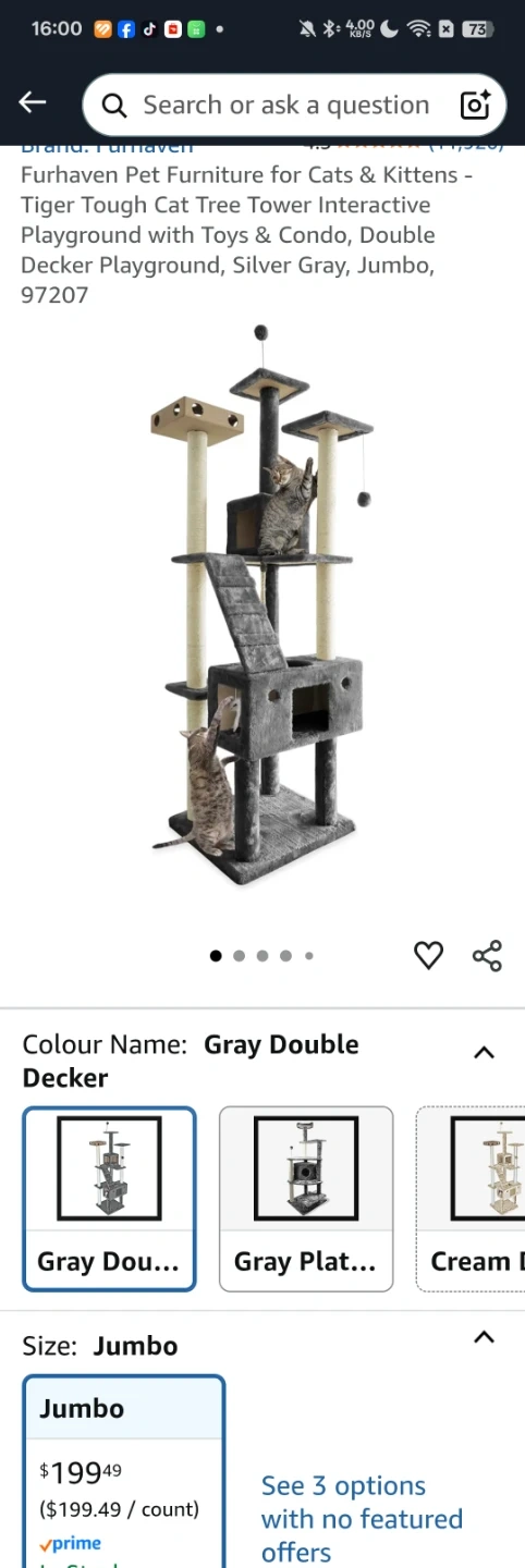 65Selling a Furhaven cat tree in gray, jumbo size. It's the Tiger Tough Cat Tree Tower Interactive Playground with Toys & Condo, Double Decker Playground. Originally bought for $199.49.