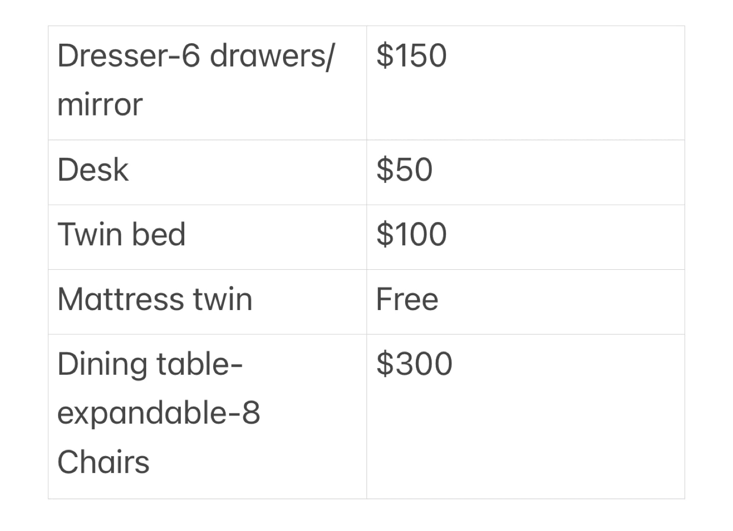 I’m selling multiple pieces of furniture, all taken apart, stored in the storage, in good condition and ready for pickup. Available items: • 6-Drawer Dresser • Desk + Chair • Twin Bed Frame • Twin Mattress • Expandable Dining Table • 6 Dining Chairs • TV Table • Living room rug 💲 Prices negotiable – can sell individually or as a bundle. 📍 Pickup only. Message me if you’d like more details or to arrange pickup.