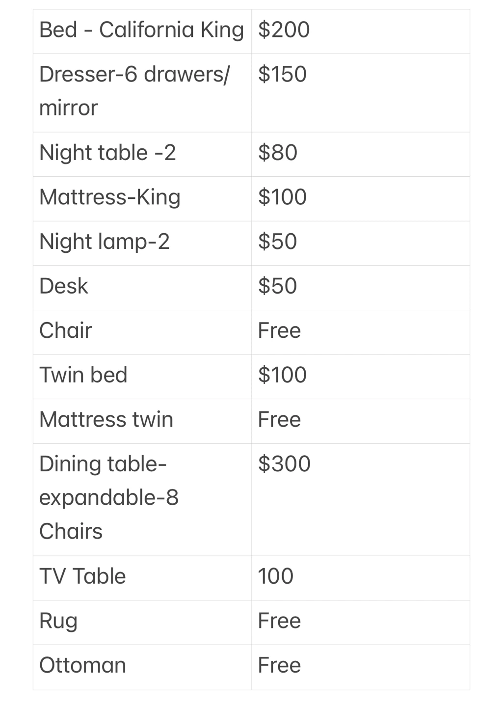 I’m selling multiple pieces of furniture, all taken apart, stored in the storage, in good condition and ready for pickup. Available items: • California King Bed (frame, taken apart) • King Mattress • 6-Drawer Dresser • 2 Night Tables • Desk + Chair • Twin Bed Frame • Twin Mattress • Expandable Dining Table • 8 Dining Chairs • TV Table • Living room rug 💲 Prices negotiable – can sell individually or as a bundle. 📍 Pickup only. Message me if you’d like more details or to arrange pickup.