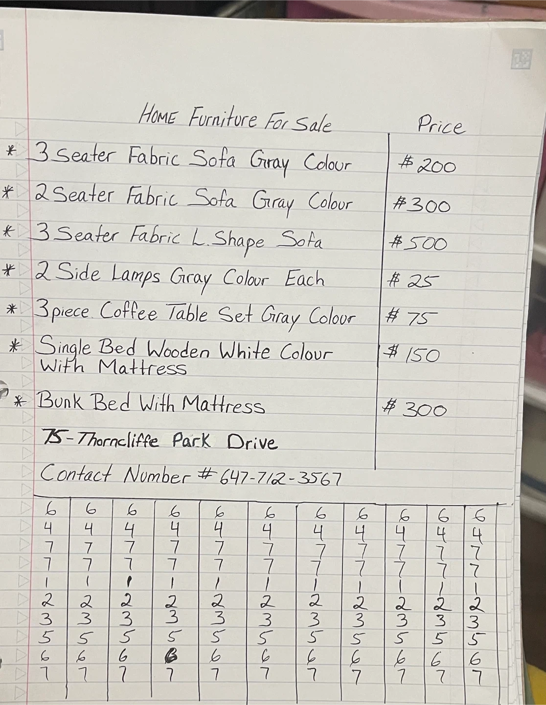 10I'm selling a variety of home furniture. Here's what's available: - 3 Seater Fabric Sofa, Gray Colour - $200 - 2 Seater Fabric Sofa, Gray Colour - $300 - 3 Seater Fabric L. Shape Sofa - $500 - 2 Side Lamps, Gray Colour Each - $25 - 3 Piece Coffee Table Set, Gray Colour - $75 - Single Bed, Wooden White Colour with Mattress - $150 - Bunk Bed with Mattress - $300 Contact me if you're interested!