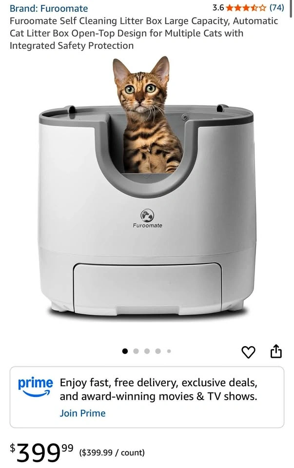 Used Like New / Fully functional Retail Price: $399.99+tax on Amazon Modern, large-capacity self-cleaning litter box for cats! This FurooMate automatic litter box uses motion sensors and a smart safety system to automatically clean waste after each use — perfect for multiple cats or busy pet parents. ✅ Large open-top design with integrated odor control ✅ Auto-cleaning + safety lock feature ✅ Detachable waste drawer with liners included ✅ Ideal for small to large cats ✅ Tested, sanitized, and ready to use Dimensions: Width × Depth × Height: 21.6″ × 21.6″ × 18.5″ (≈ 55 × 55 × 47 cm) • When fully rotated (max height): 21.6″ × 21.6″ × 25.6″ (≈ 55 × 55 × 65 cm) • Litter Area (interior usable space): ~ 13.5″ × 16.8″ × 11.4″ (≈ 34 × 43 × 29 cm) • Max load (volume of litter): 6 L (≈ 1.3 gal) • Waste drawer dimensions: ~ 10.7″ × 14.3″ × 5″ (≈ 27 × 36 × 13 cm) • Weight (with waste bin): ≈ 25 lbs (≈ 11.5 kg) 📦 Comes with all parts: power cable, waste bags, manual & box 📍 Pickup Yonge & Eglinton 💬 Message for details or quick pickup