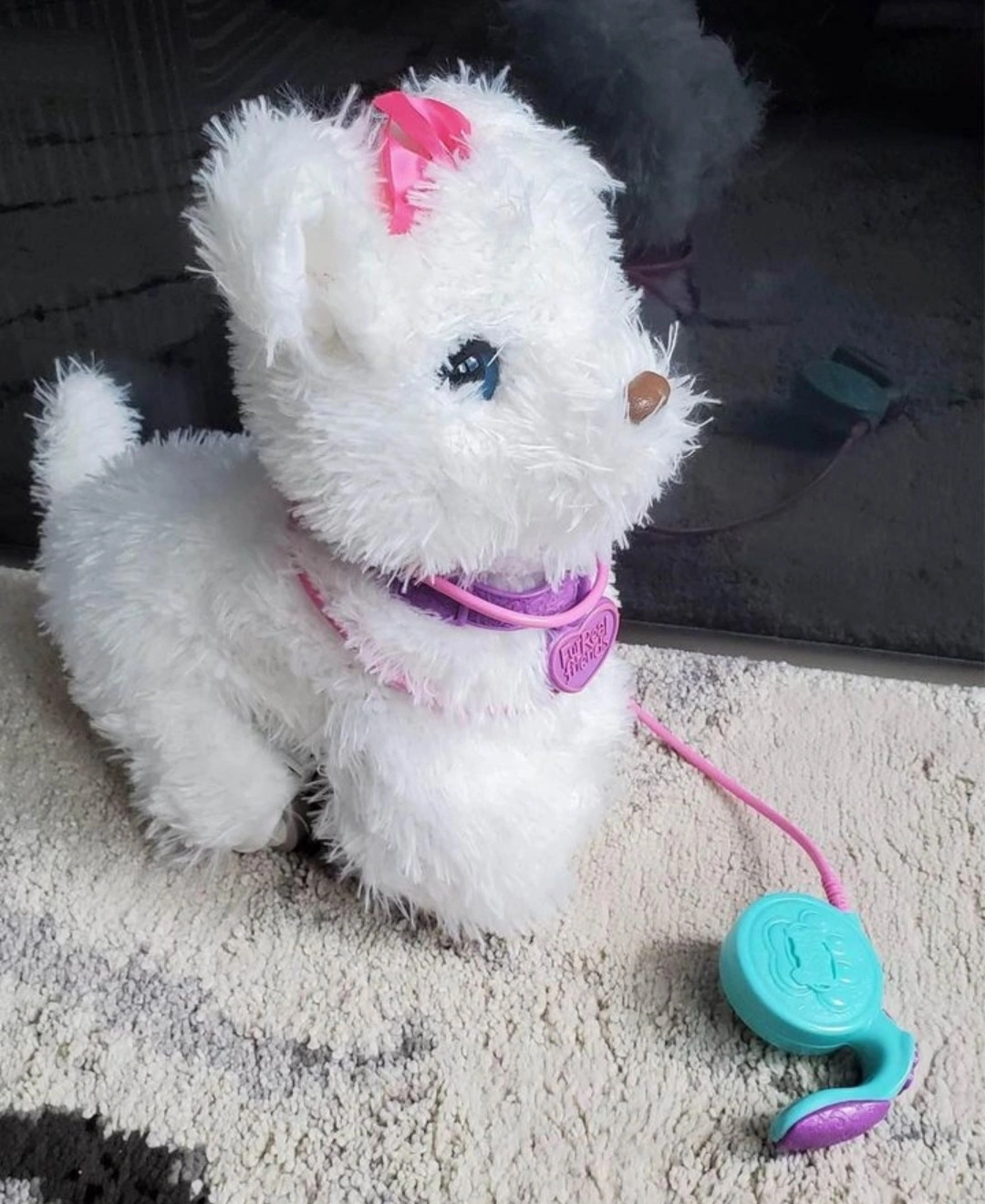 White puppy with pink bow and leash. Leash is turquoise and purple. Walks and barks.