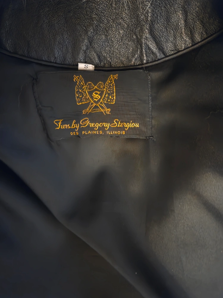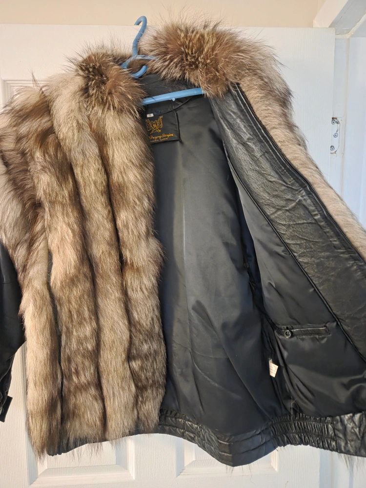 Selling a stylish fur and leather jacket from Furs by Gregory Stergiou. It's a size small and in great condition. The jacket features fur on the front and collar, with leather sleeves and accents. Perfect for staying warm and fashionable!