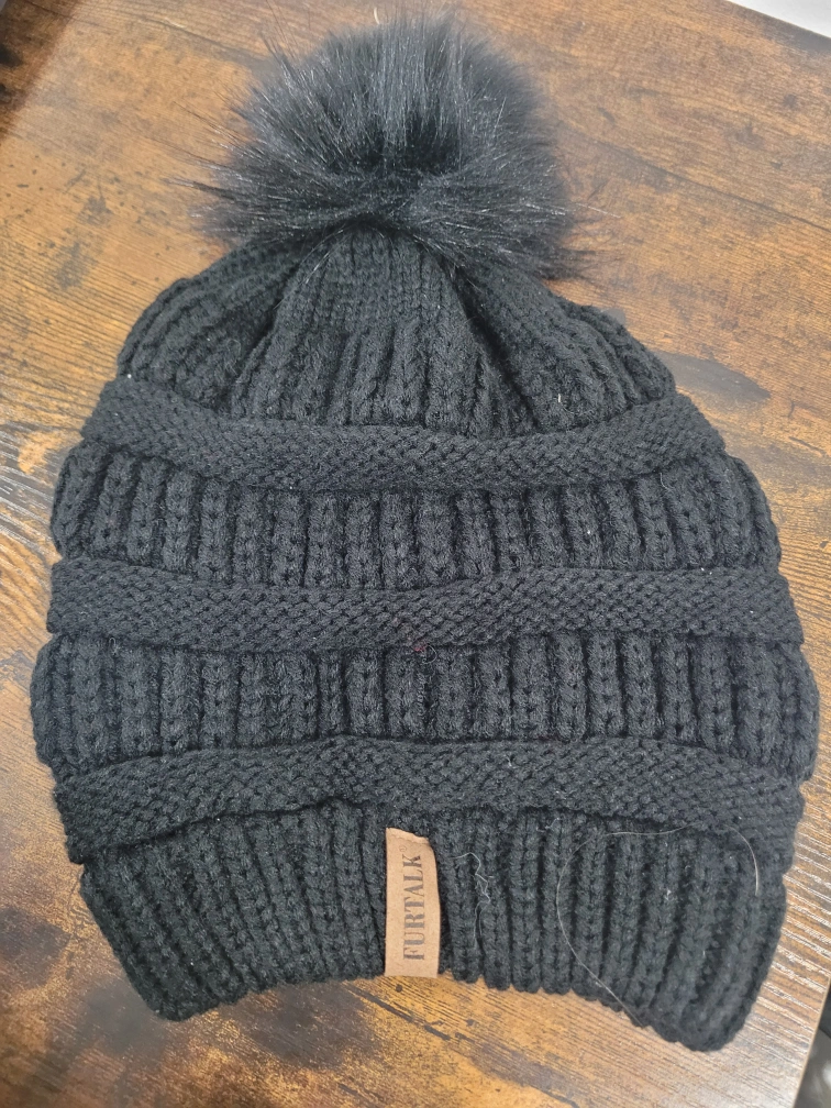 Cozy up with this FURTALK black knit beanie! It features a stylish detachable pom pom on top and is perfect for keeping warm during the colder months. The material is soft and comfortable, making it a great addition to your winter wardrobe