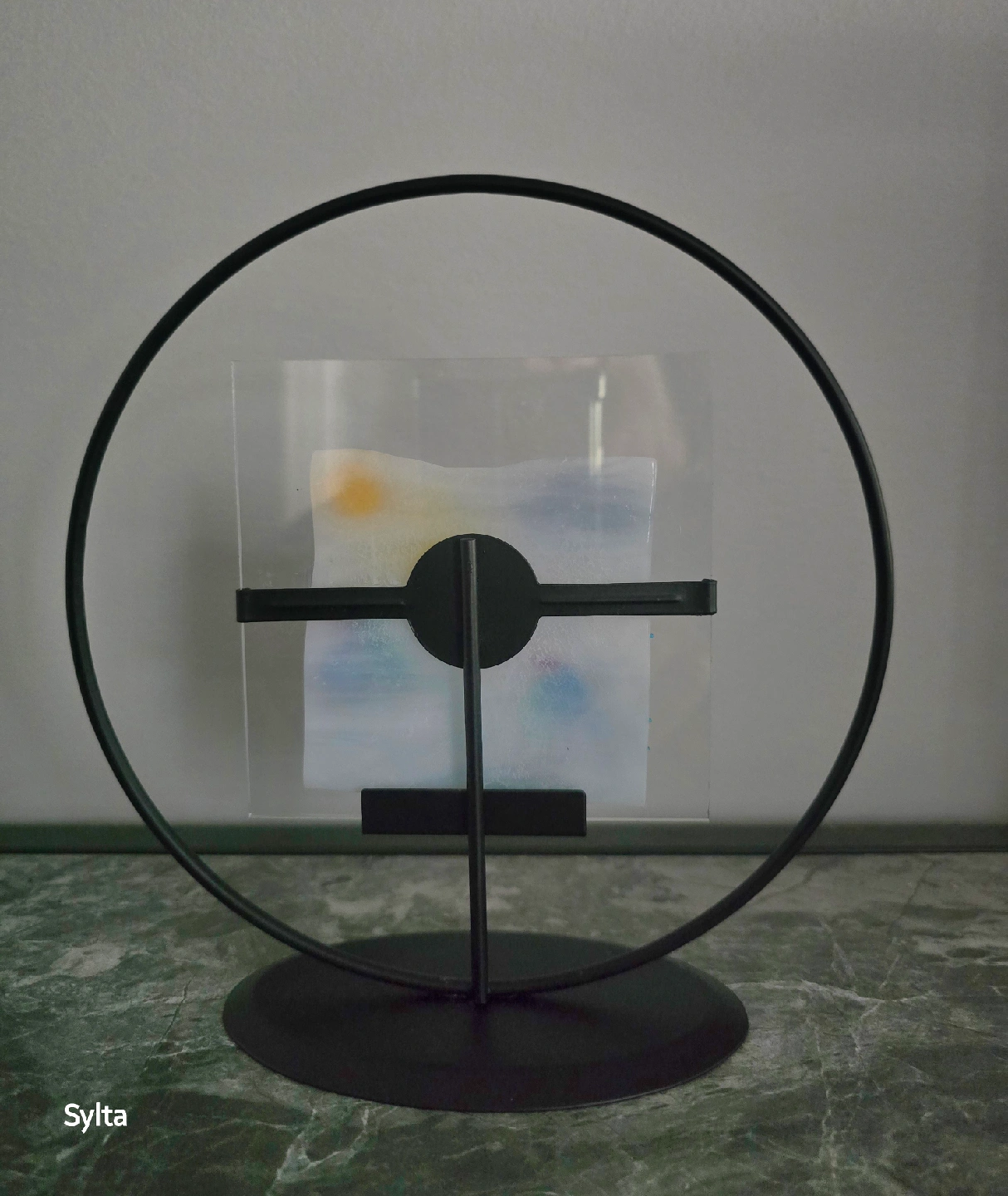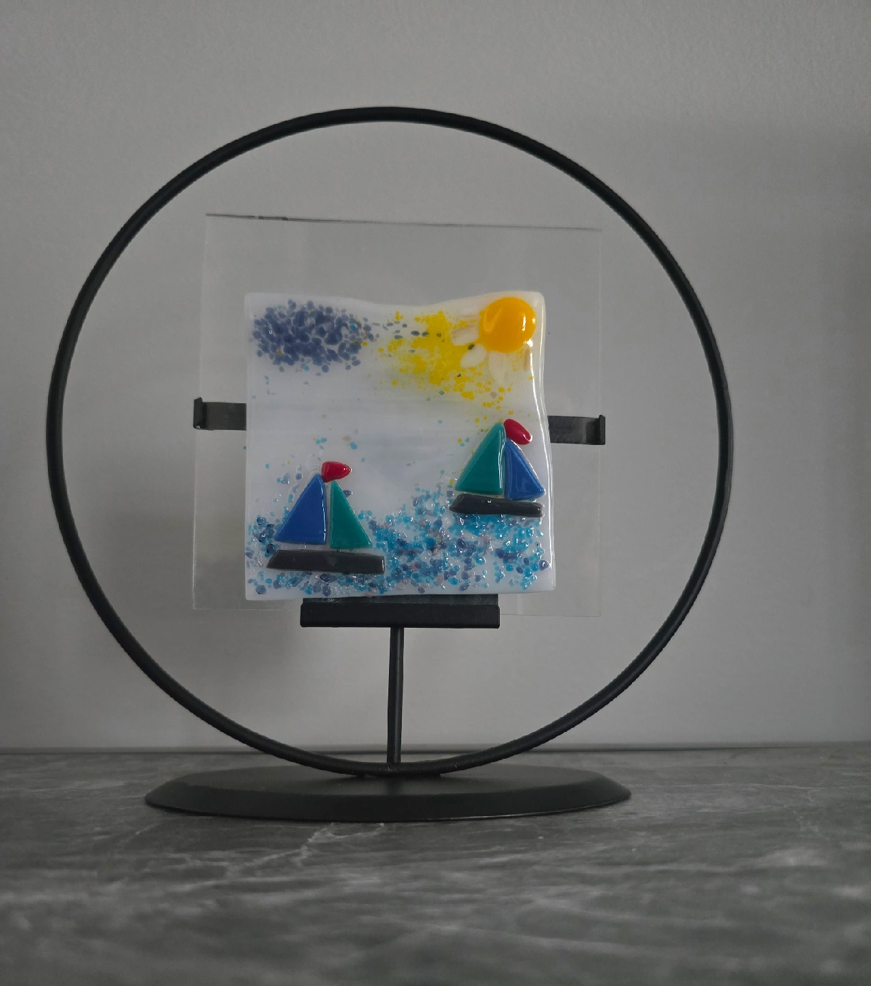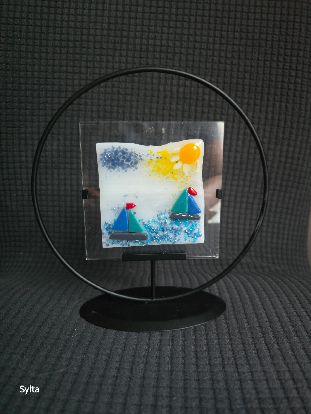 28This is a lovely piece of fused glass art by a local Artist. It features a charming sailboat scene with a sun and sky design, all encased in a black metal stand. A unique addition to any room!