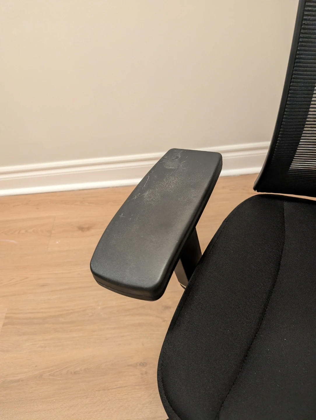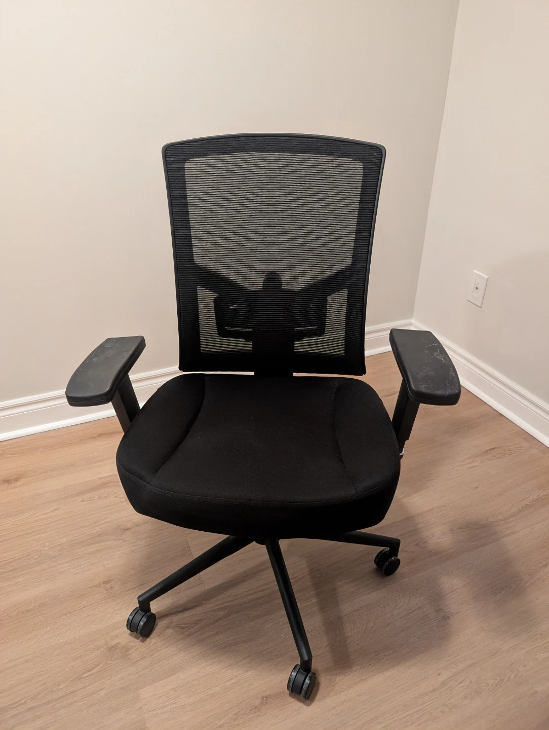 Selling a comfortable black office chair! It features a breathable mesh back and adjustable armrests for a great ergonomic experience. There are some signs of wear on the armrests, but otherwise it's in good condition and ready for a new home