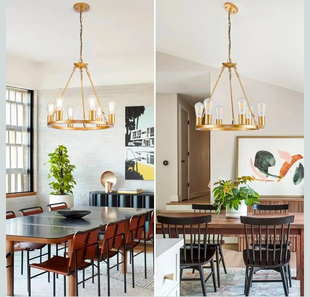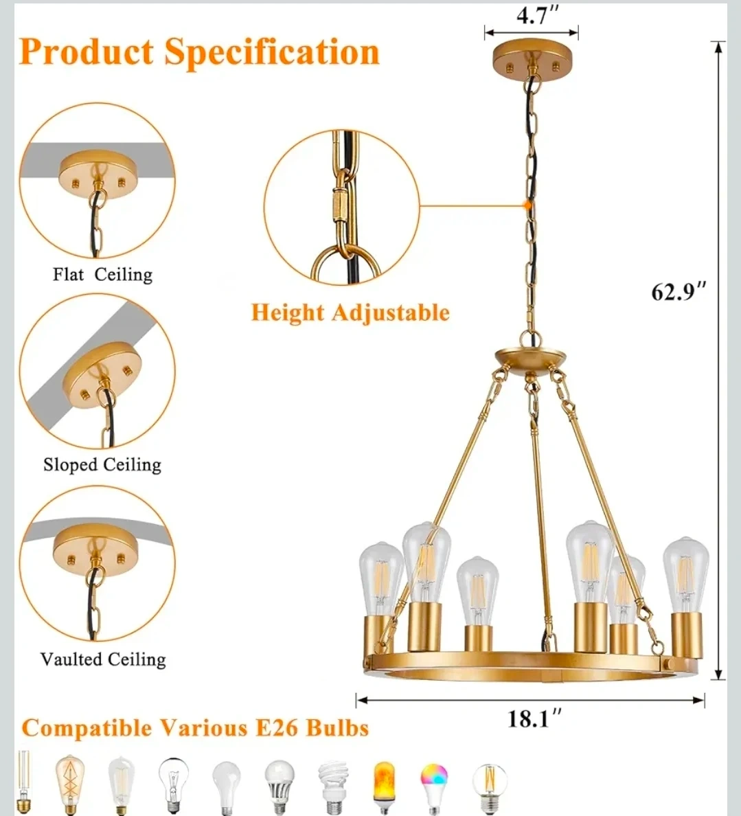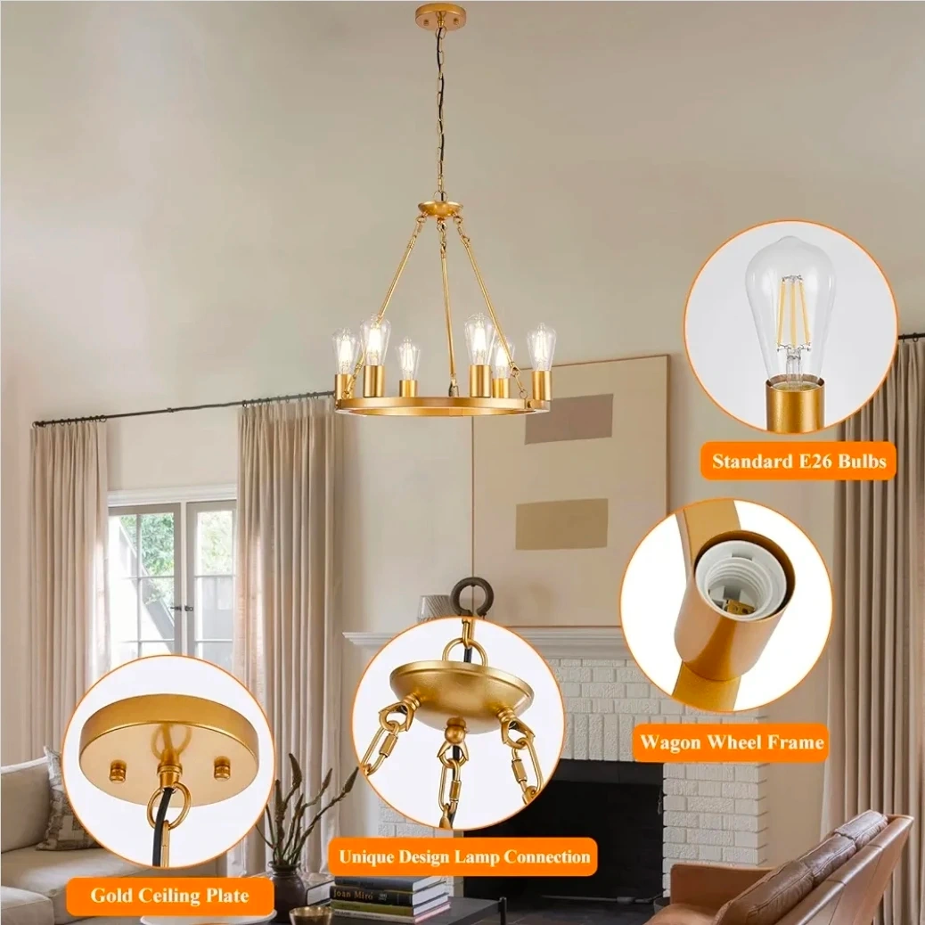 This modern wagon wheel chandelier features a gold finish and six lights. It's height adjustable and compatible with various E26 bulbs. The fixture's design accommodates flat, sloped, and vaulted ceilings.