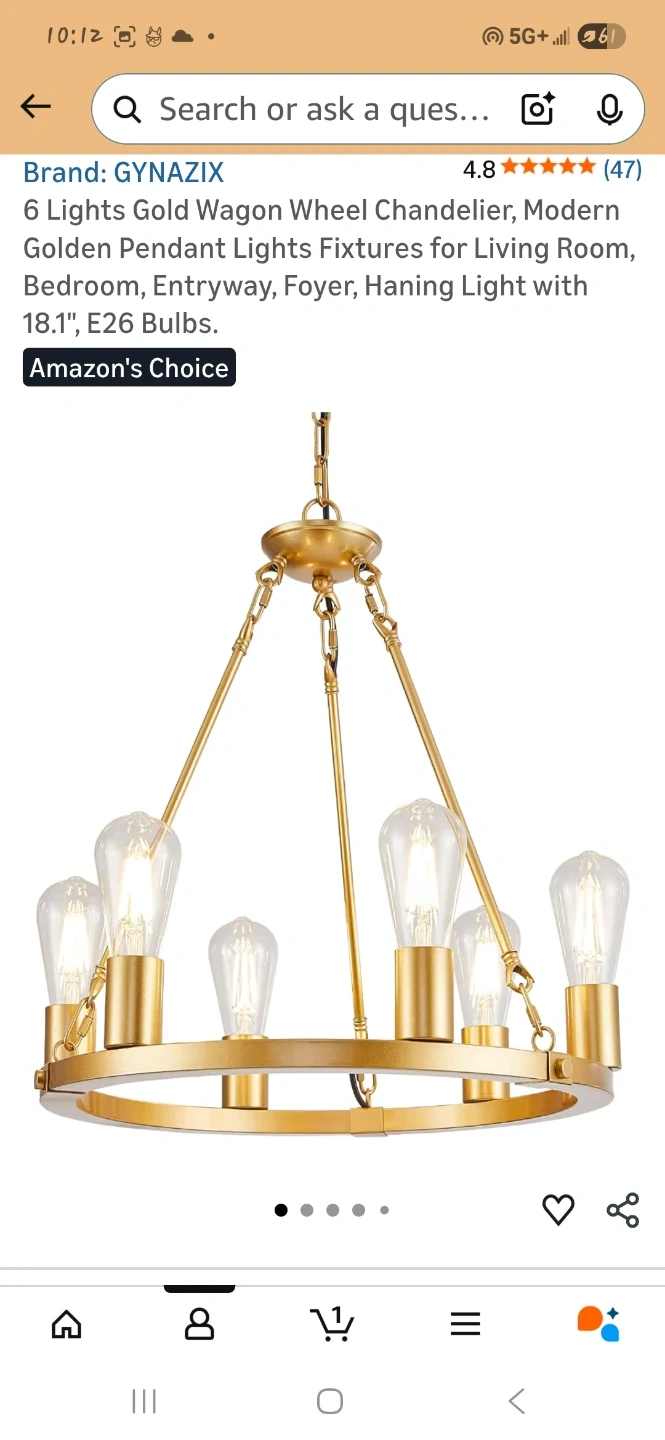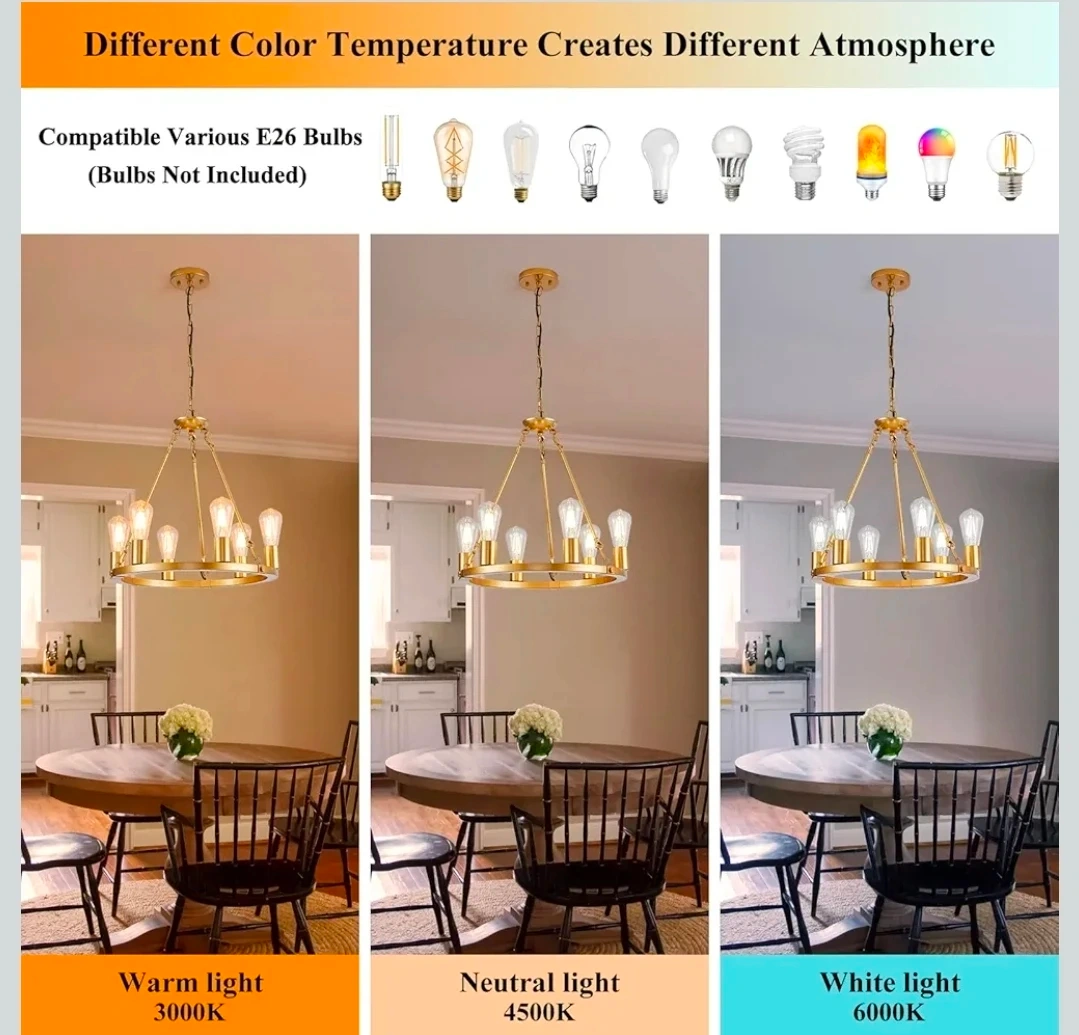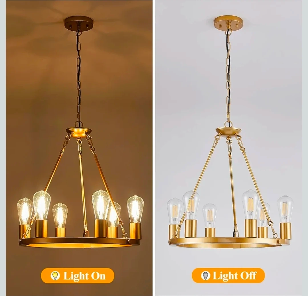 This modern wagon wheel chandelier features a gold finish and six lights. It's height adjustable and compatible with various E26 bulbs. The fixture's design accommodates flat, sloped, and vaulted ceilings.