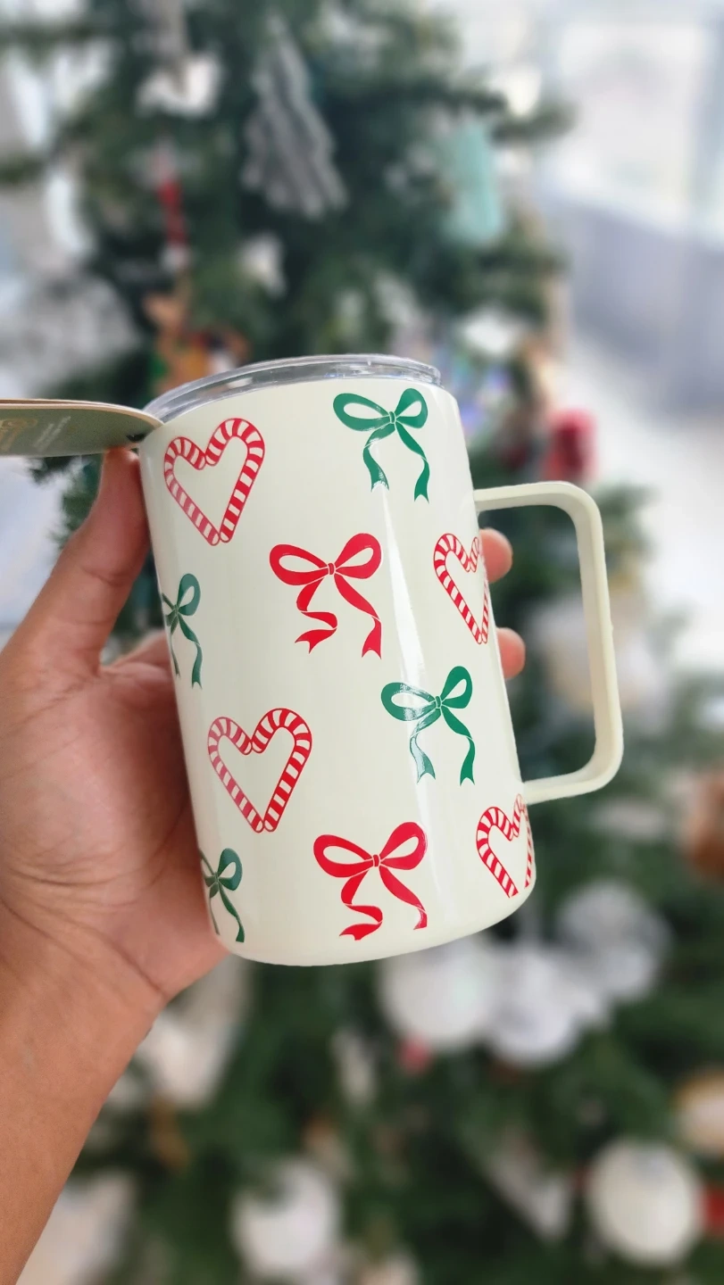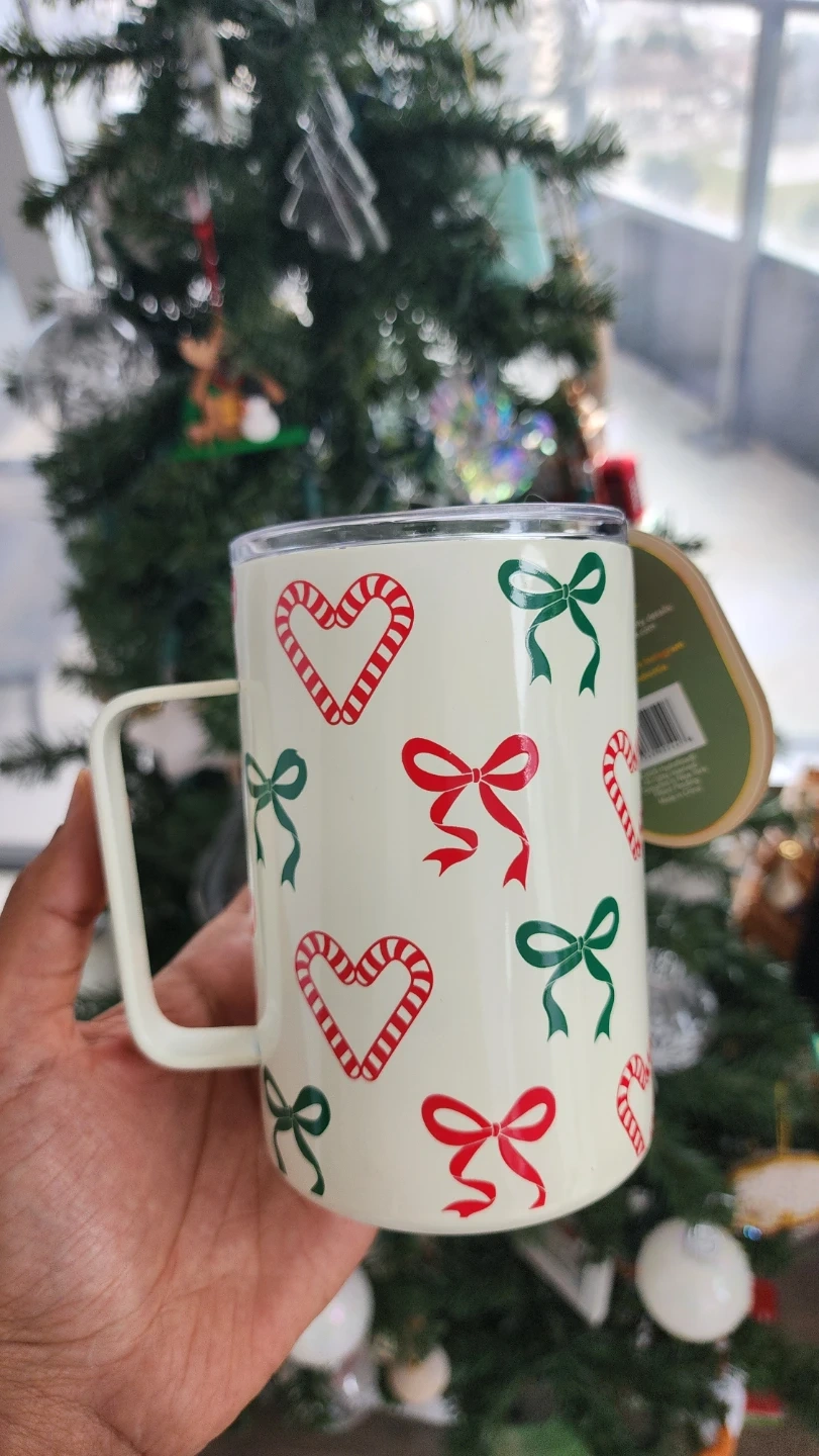 - It holds 17 oz (500 ml) and features a cute design with candy canes and bows.