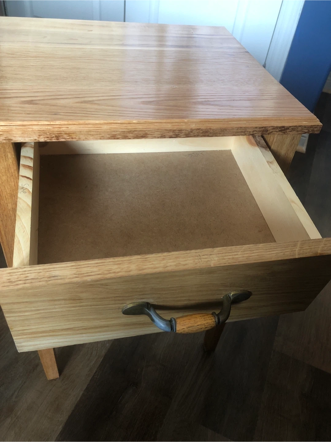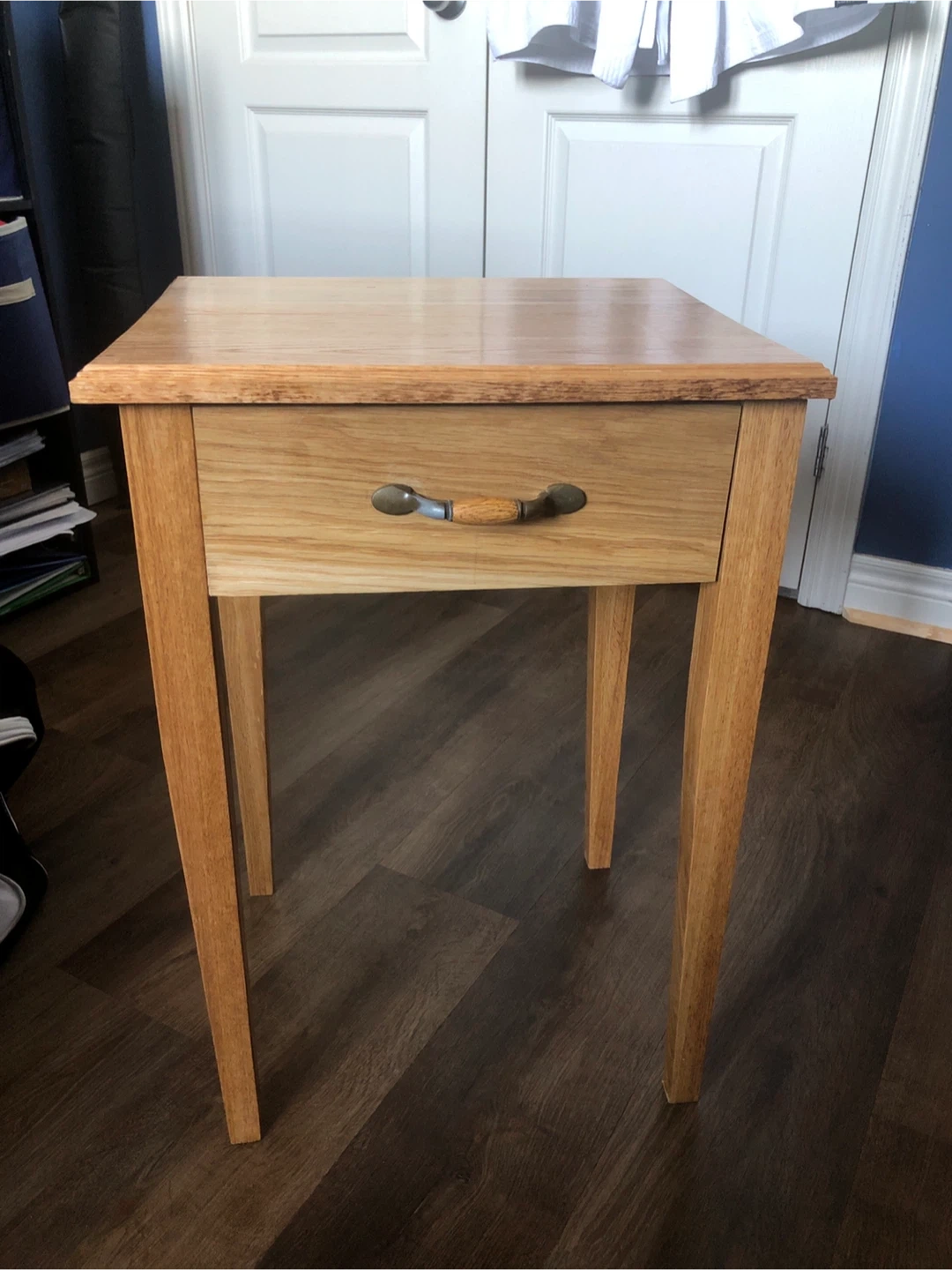 A nice end table made from solid wood. It features a single drawer with a vintage-style pull. Great for a bedroom or living room.