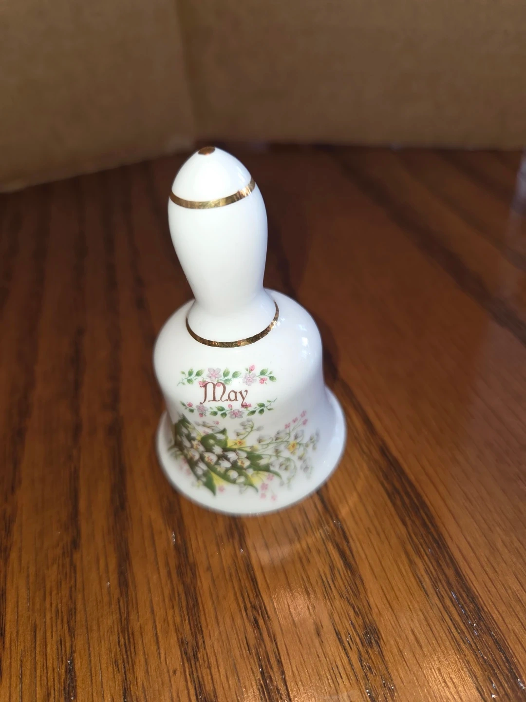 This white porcelain bell features a delicate floral design with the word "May" printed on it. It's accented with gold bands. This bell would make a lovely decorative piece for your home.