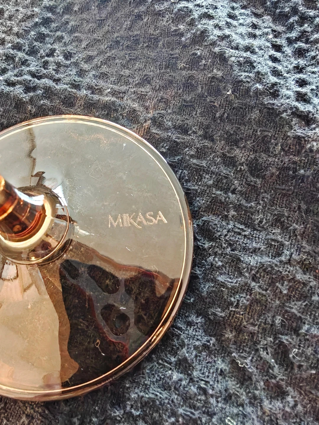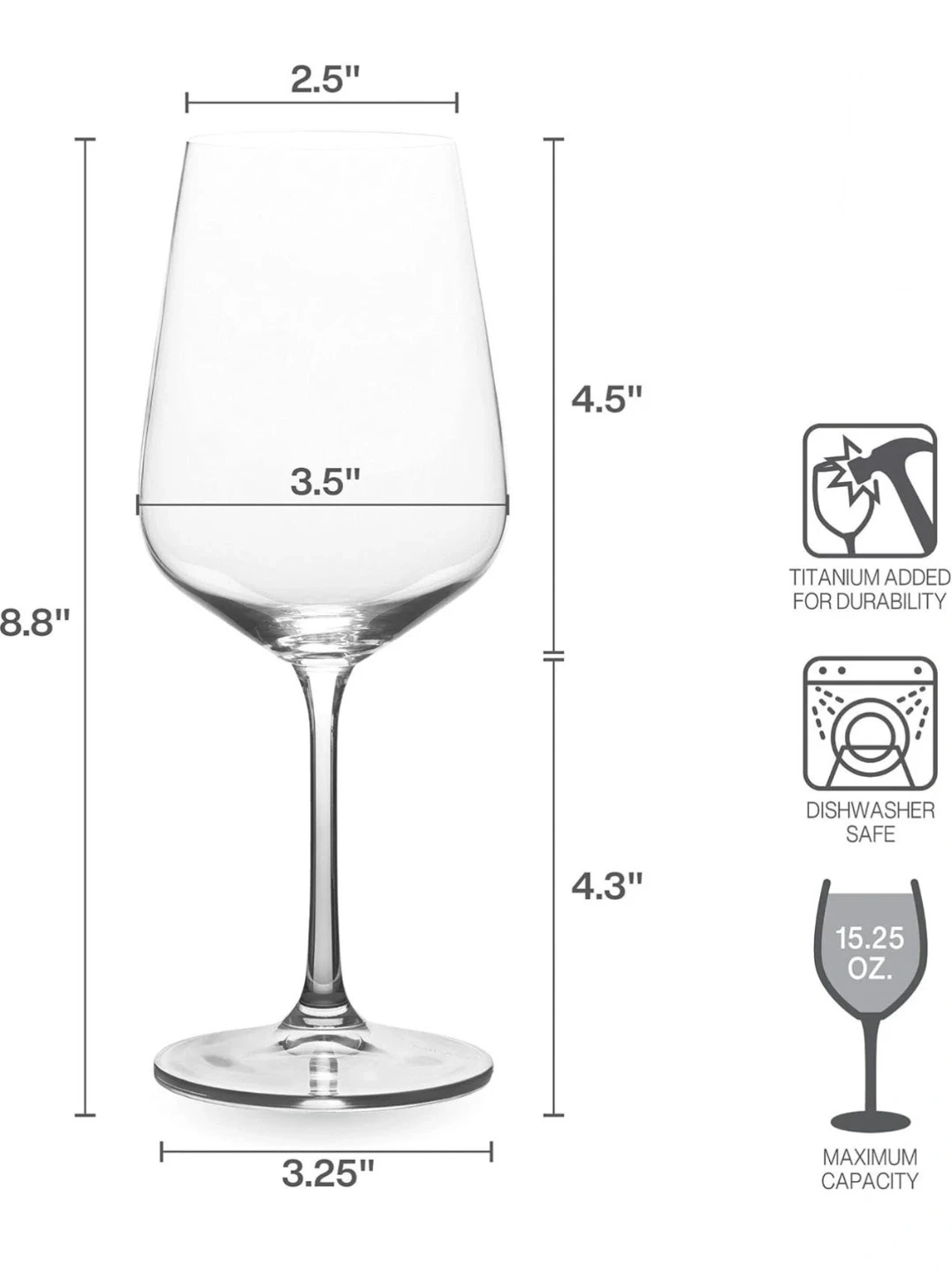 New Mikasa wine glasses with beautiful amber-coloured bases. These glasses are designed with titanium added for durability. They are dishwasher safe for easy cleaning and hold a maximum capacity of 15.25 oz. Perfect for enjoying your favourite wines!