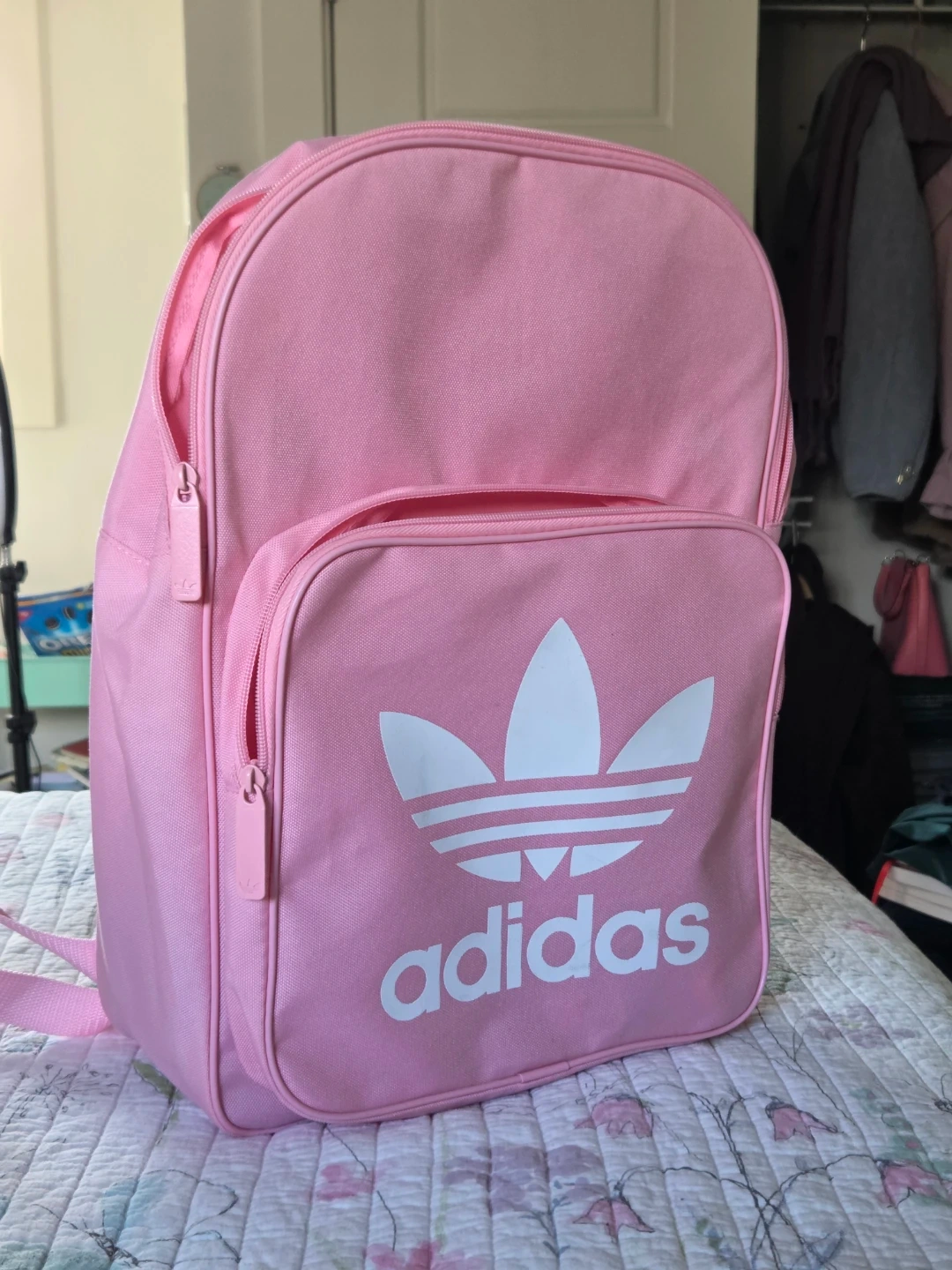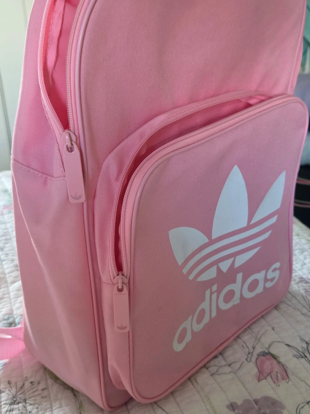 This is a pink Adidas backpack with the iconic trefoil logo. It features multiple zippered compartments for organization. Durable fabric construction. only used it couple times its really like new.