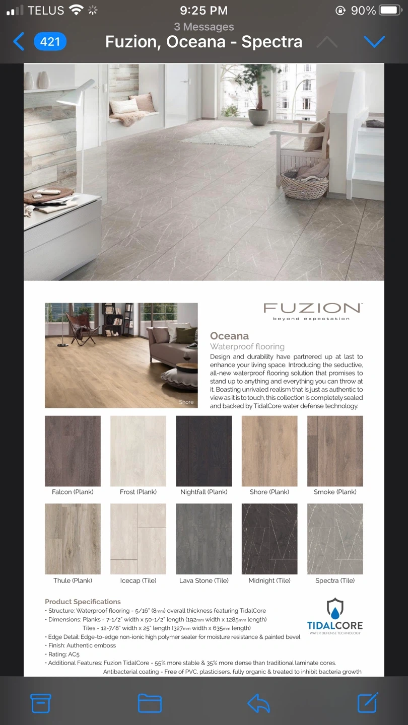 60Looking to upgrade your floors? I have Fuzion Oceana Spectra waterproof flooring available. Key features include: - Waterproof flooring for durability - Edge detail: Edge-to-edge non-ionic high polymer sealer for moisture resistance & painted bevel finish, authentic emboss - Tiles: 12-7/8" width x 25" length (327 mm width x 635 mm length) - Structure: Waterproof flooring - 5/16" (8mm) overall thickness featuring TidalCore
