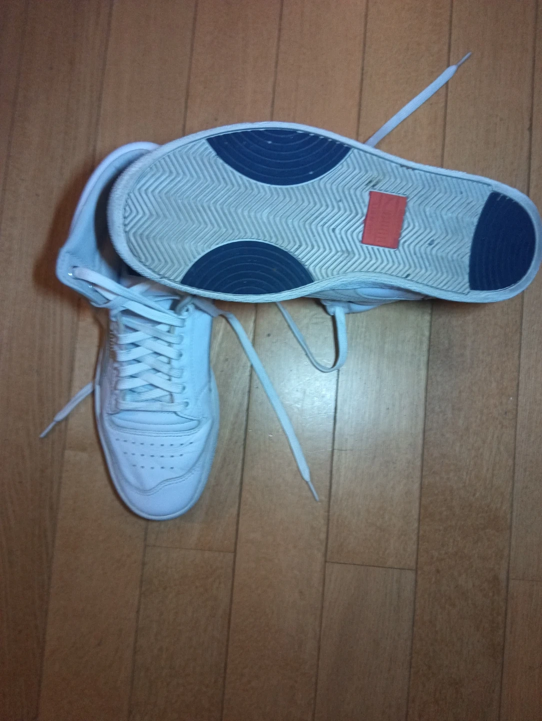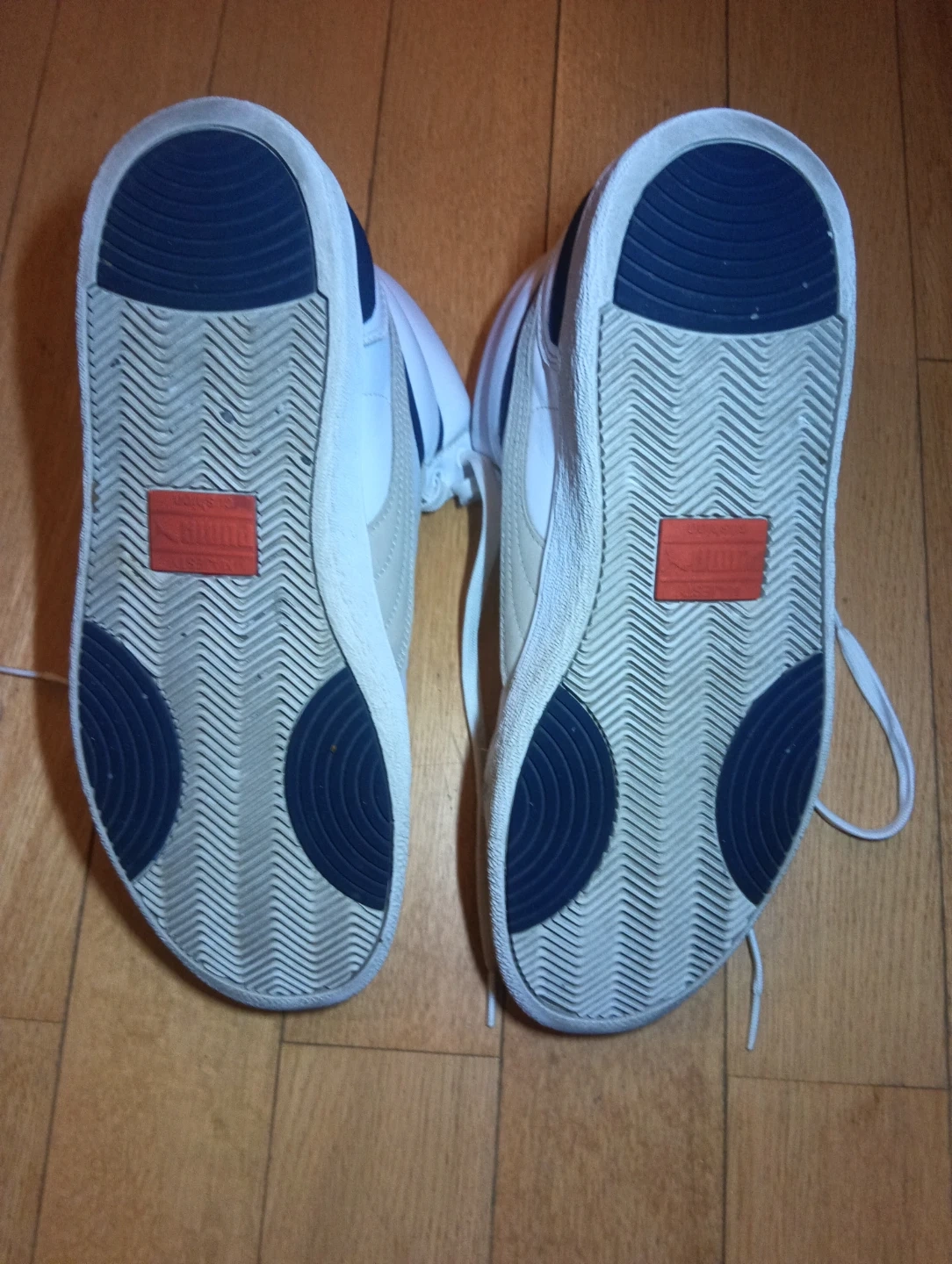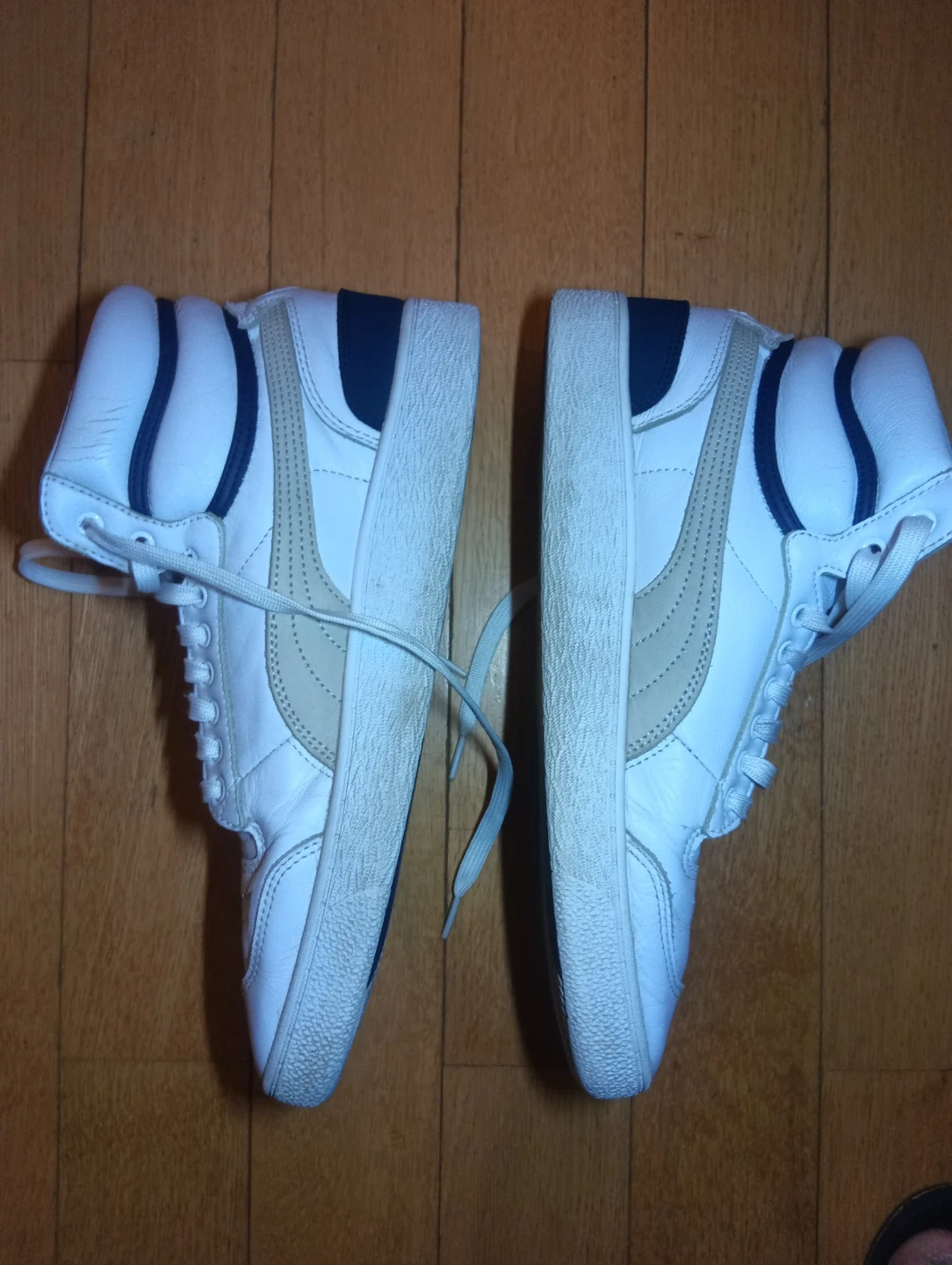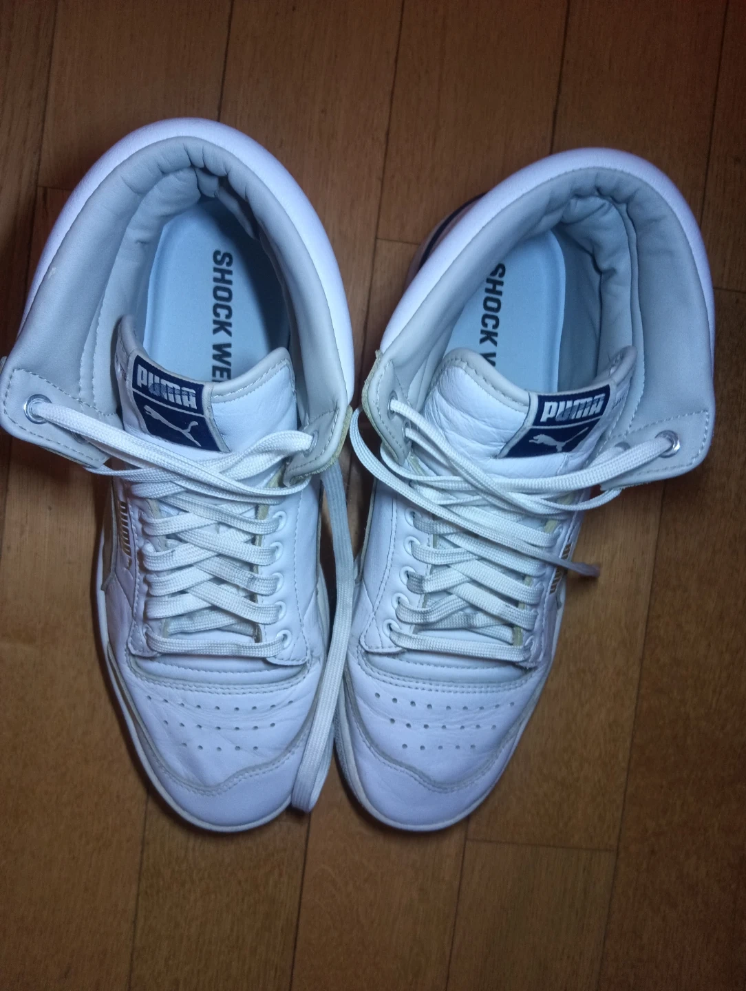 White leather Puma high top sneakers with black and beige accents. Features lace-up closure and cushioned sole. Great for casual wear!