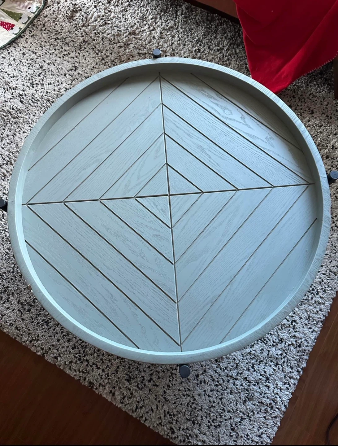 This round accent table features a light grey wood finish with a geometric pattern on top. It has a sturdy metal base for stability.
