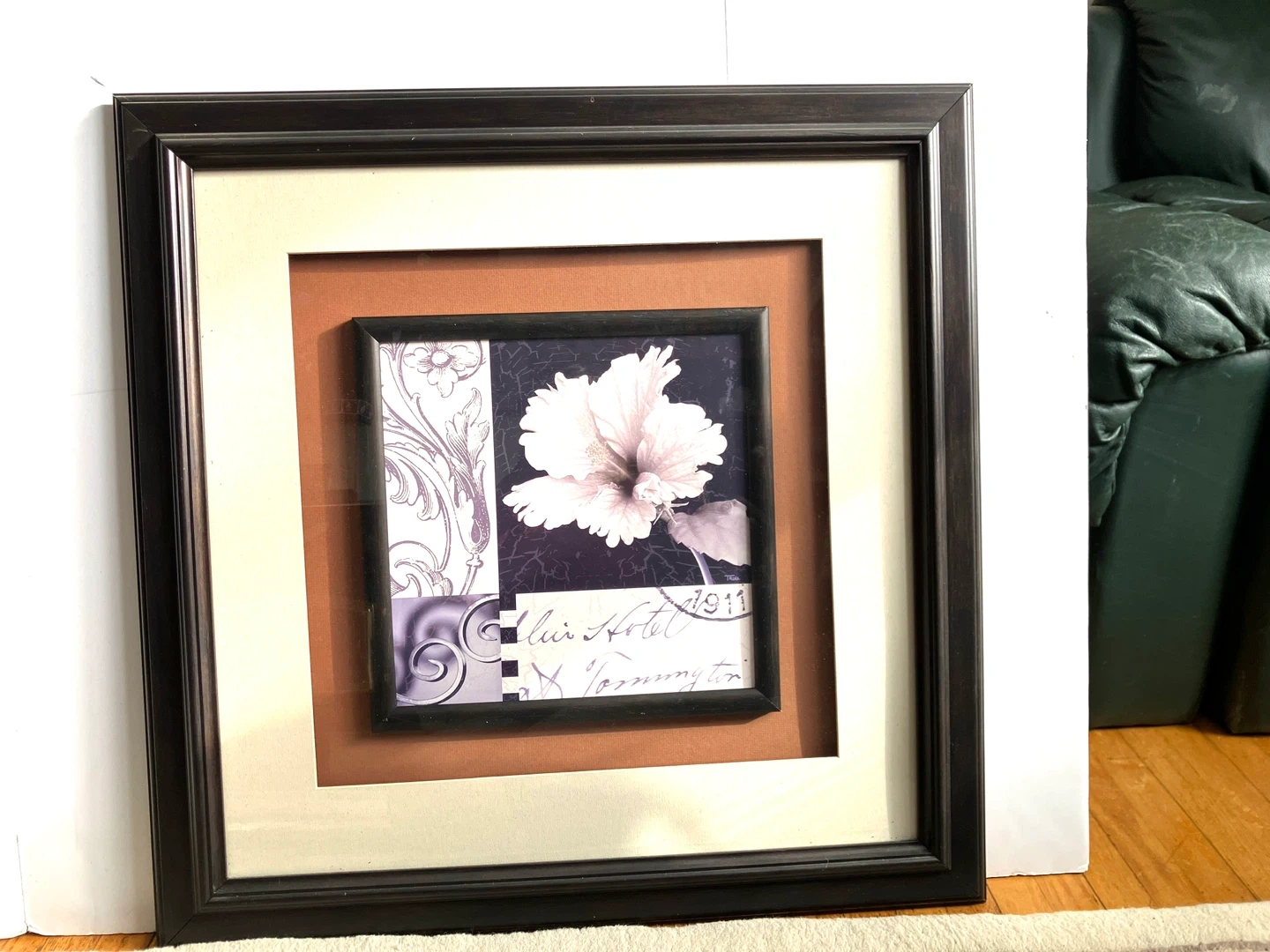 Framed decorative print featuring a hibiscus flower with ornate scrollwork and script. The artwork is matted and housed in a dark brown frame.