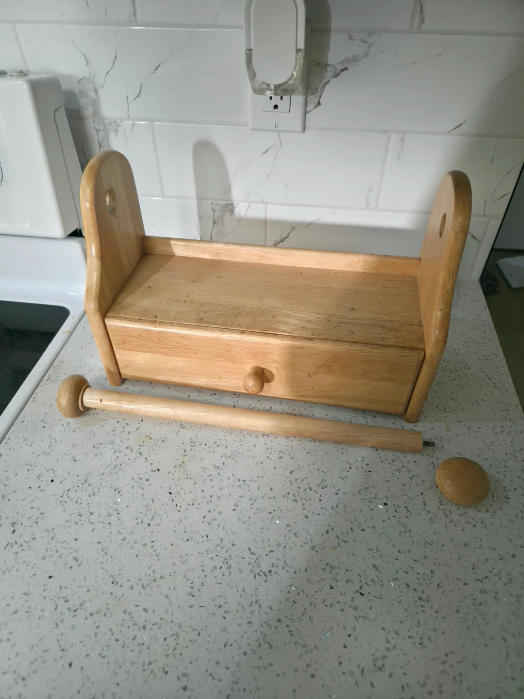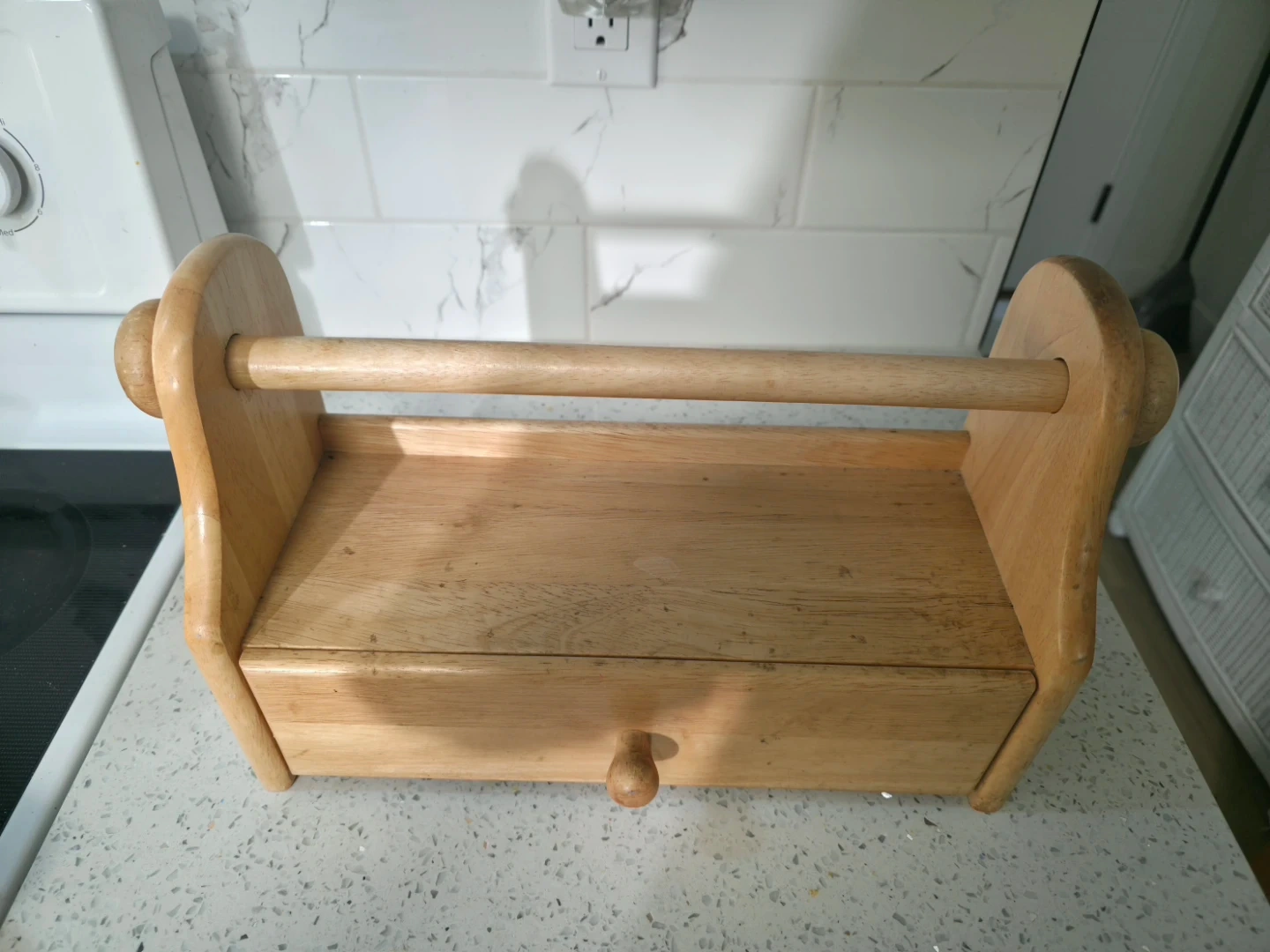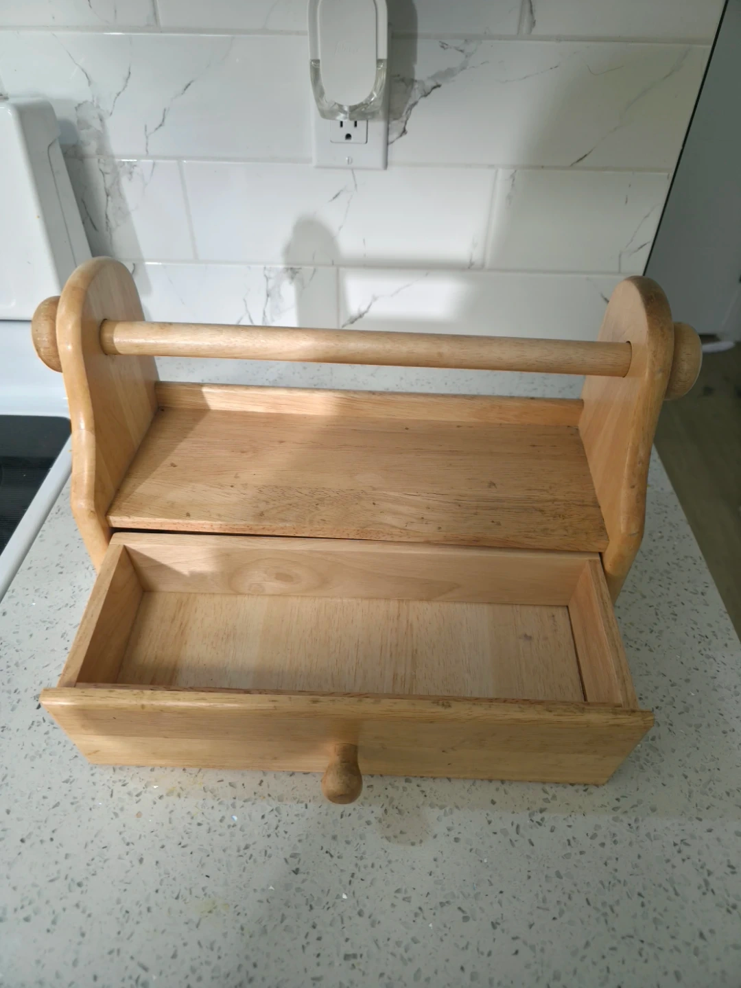 Here's a handy wooden kitchen organizer! It features a drawer and a dowel rod, perfect for holding paper towels or other kitchen essentials. It's in great shape and ready to help you declutter your countertops