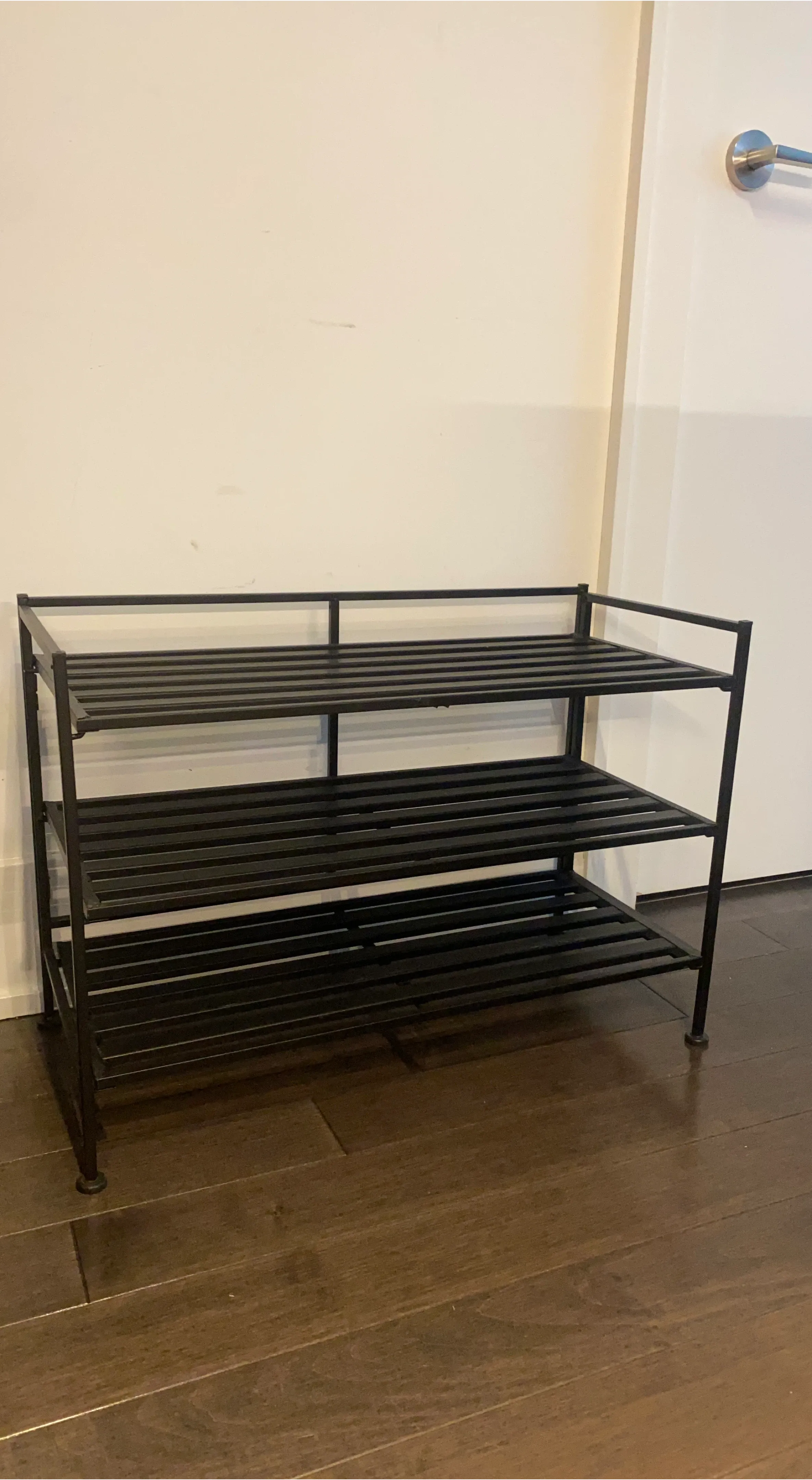 This is a 3-tier metal shoe rack. It's black and made of metal. Great for organizing your footwear!