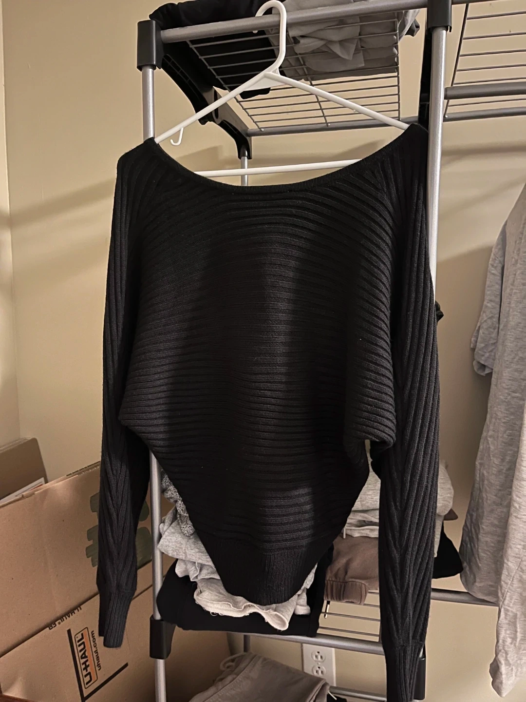 Black ribbed sweater with a V-neck and batwing sleeves. It's a size medium. This sweater's knit pattern adds texture and style. Size small