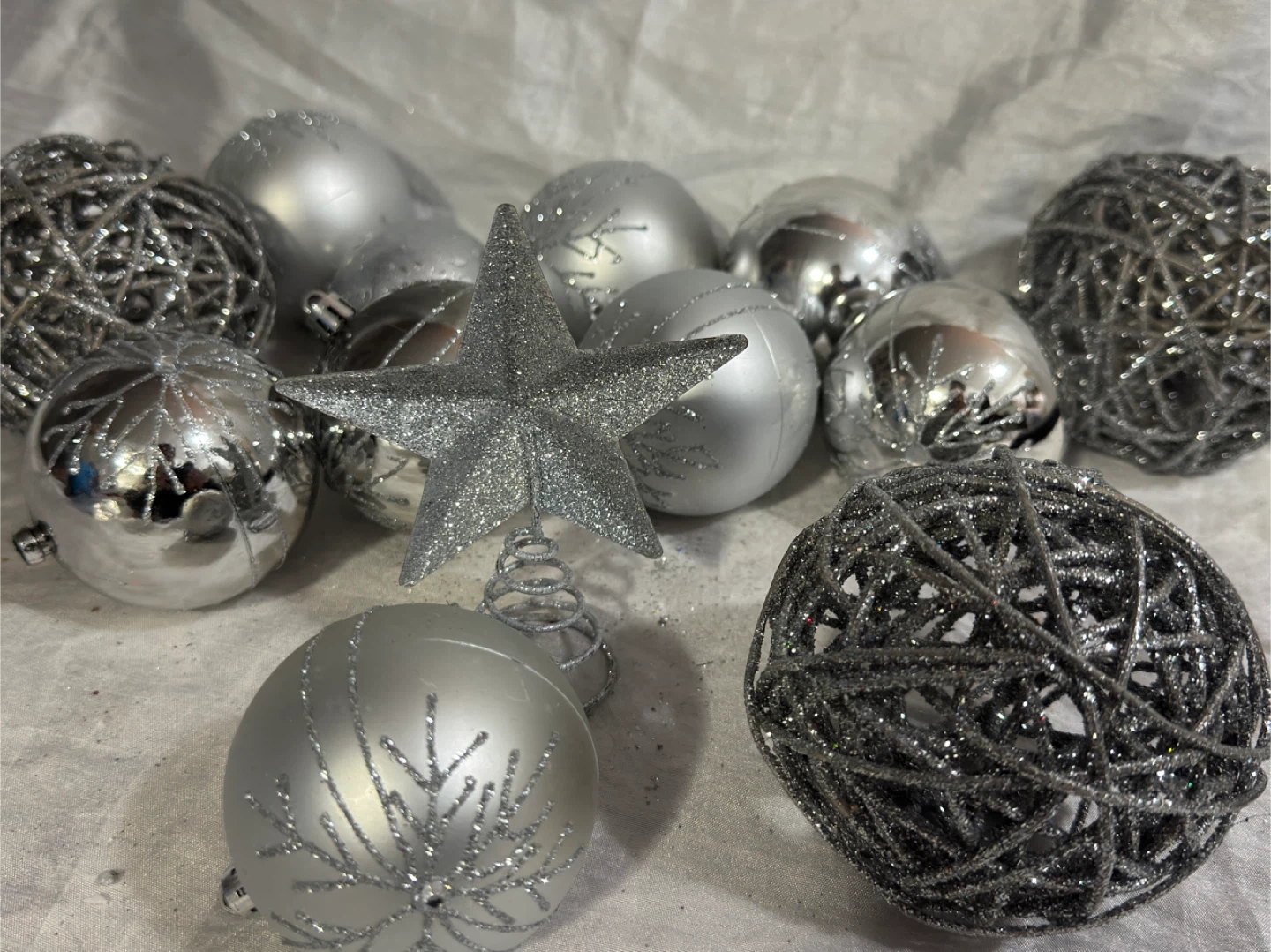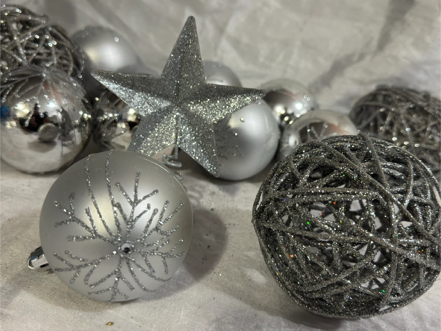 A set of silver-toned Christmas ornaments in various finishes. Includes smooth, glitter-covered, and woven ball designs, plus a star tree topper. Perfect for decorating your holiday tree!