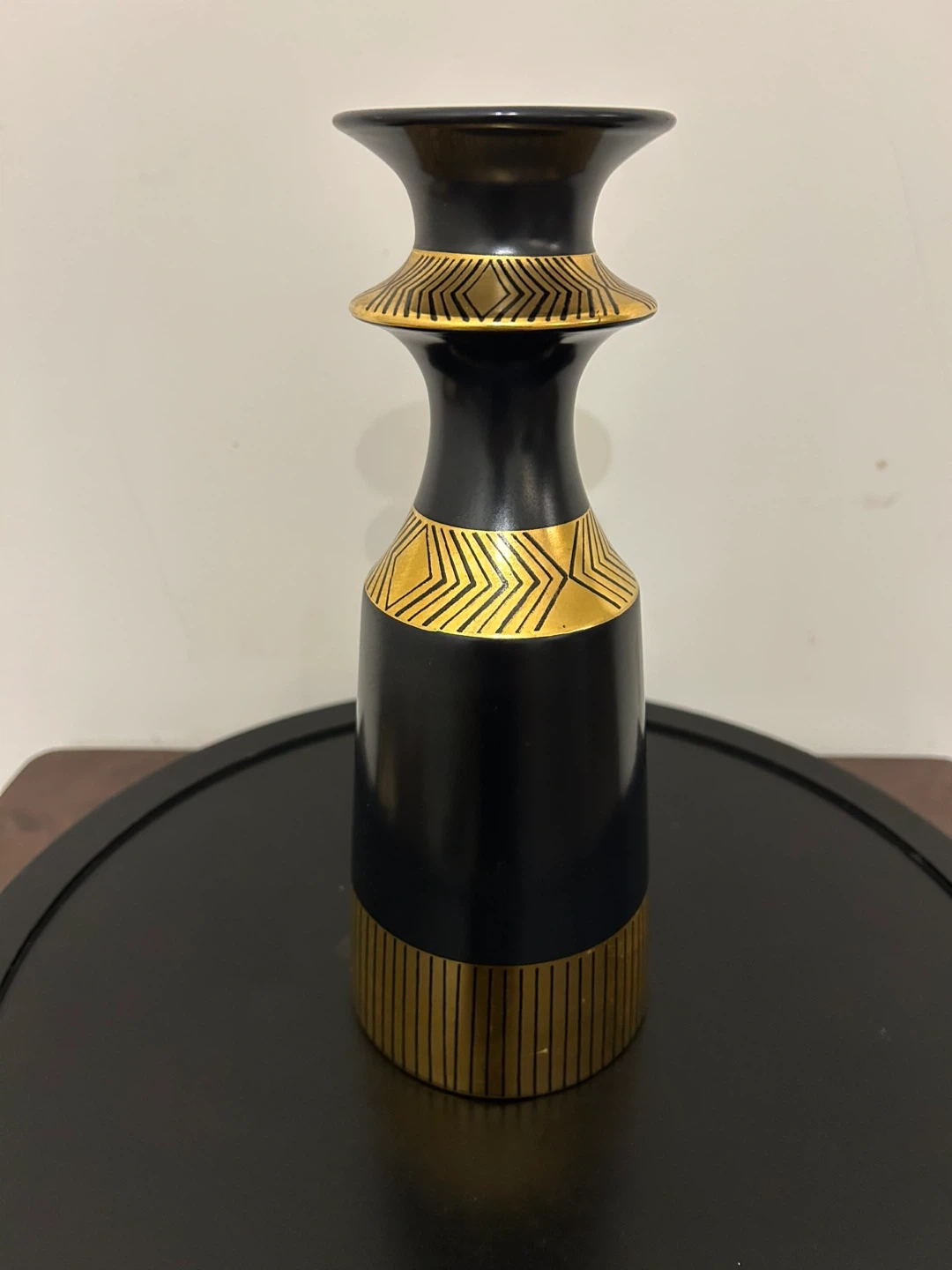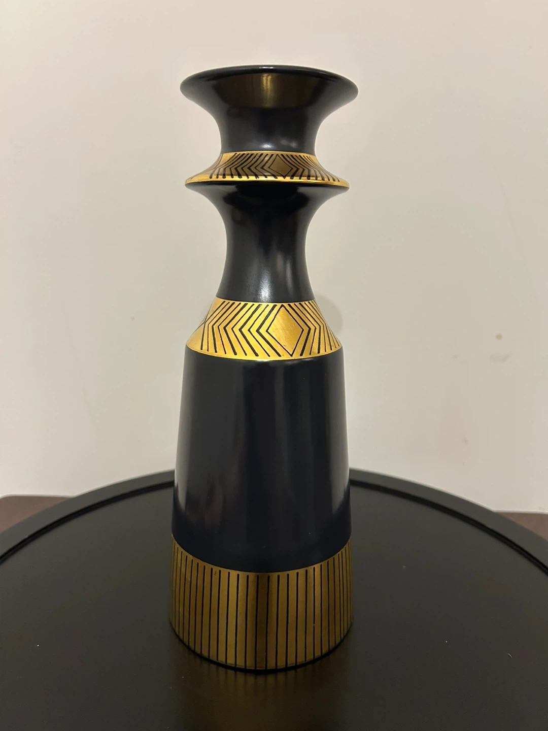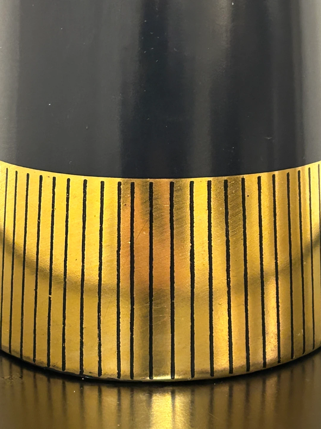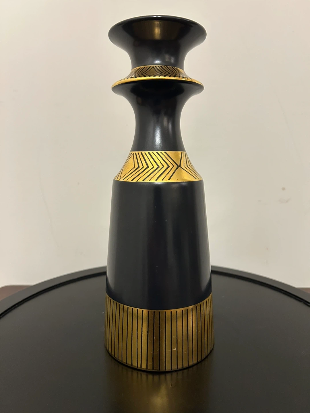 This CM7 model perfectly captures the elegance of the Space Age and Mid-Century Modern movement with its tall conical silhouette and striking matte satin black glaze. The surface is beautifully enhanced with hand-etched (sgraffito) gold geometric decoration, giving the piece a refined yet bold architectural presence.