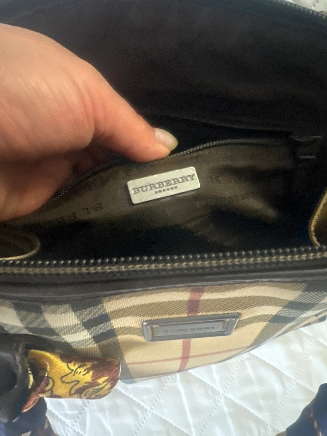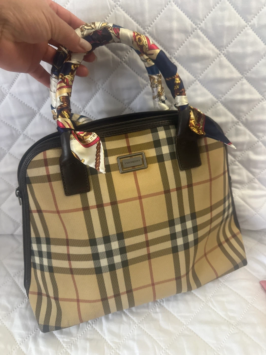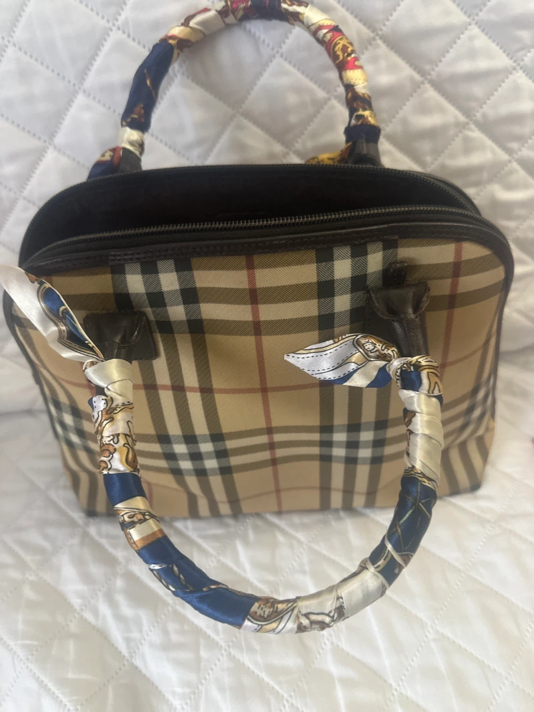 Burberry satchel bag in Haymarket check canvas. Features leather trim and handles wrapped with a decorative scarf. It has a zip-top closure.