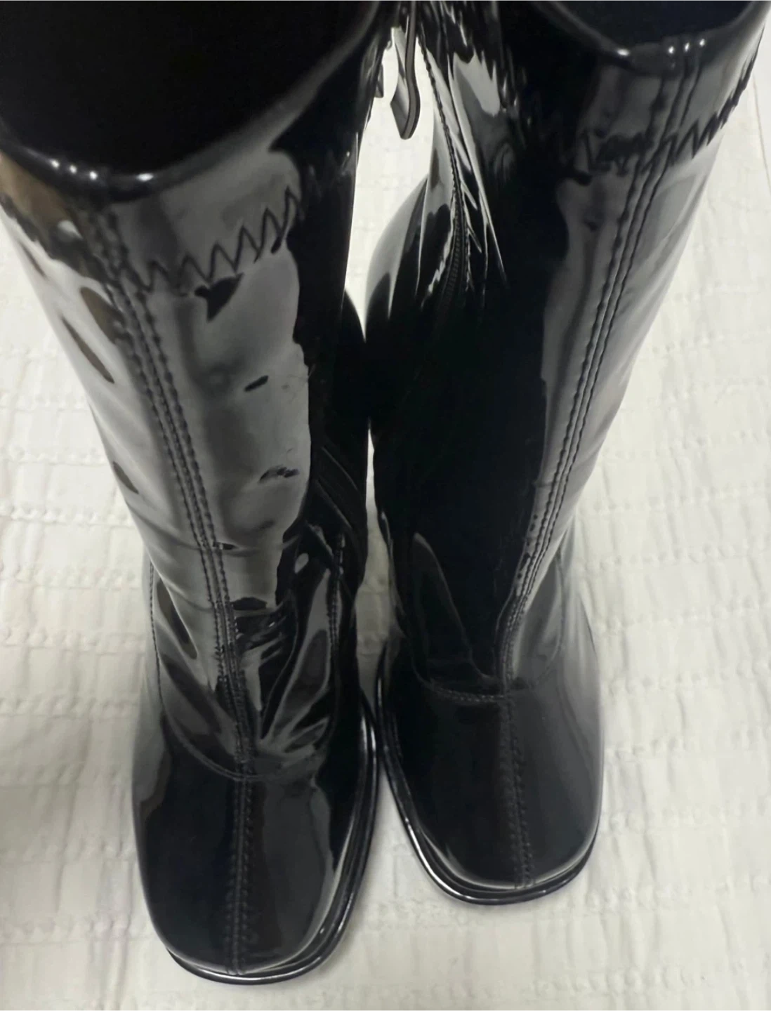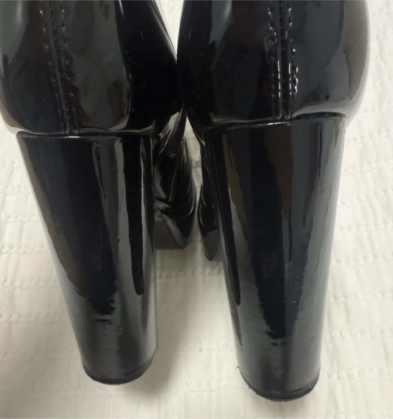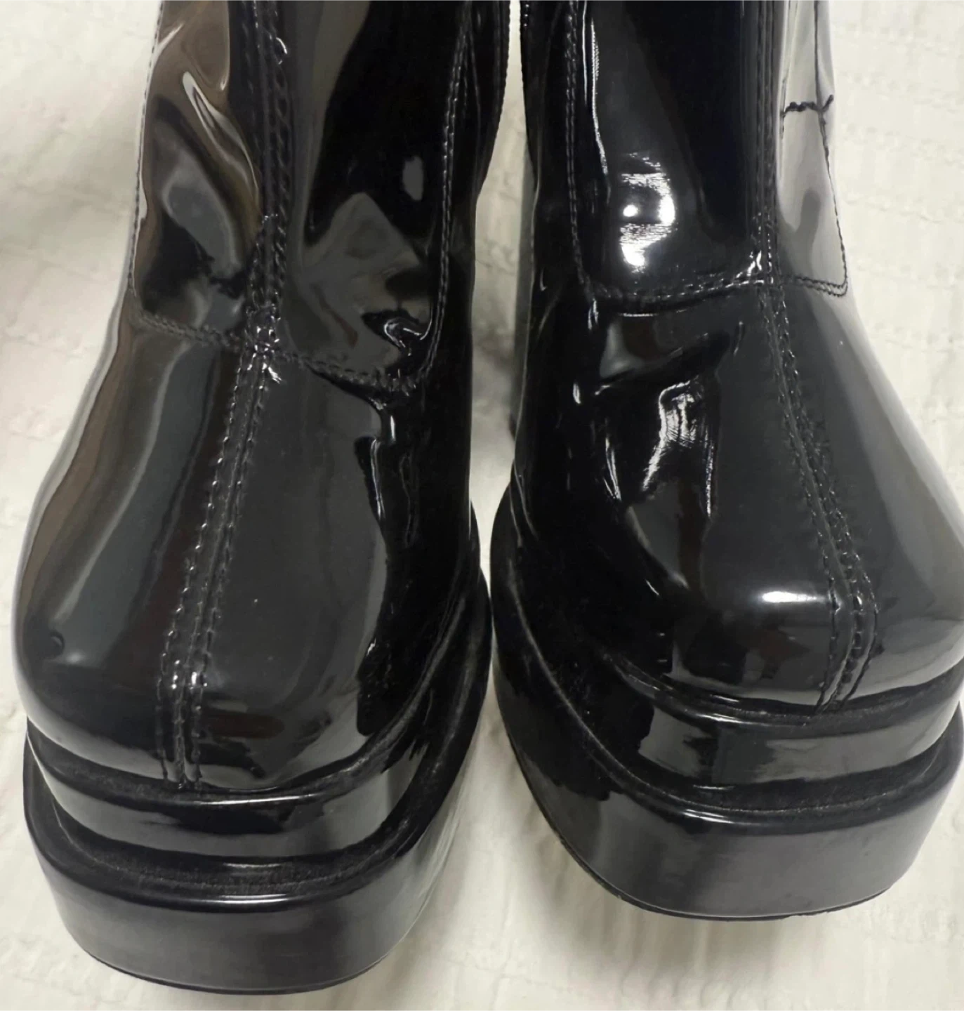 These are new shiny black patent platform boots with a thick heel and zipper closure.
