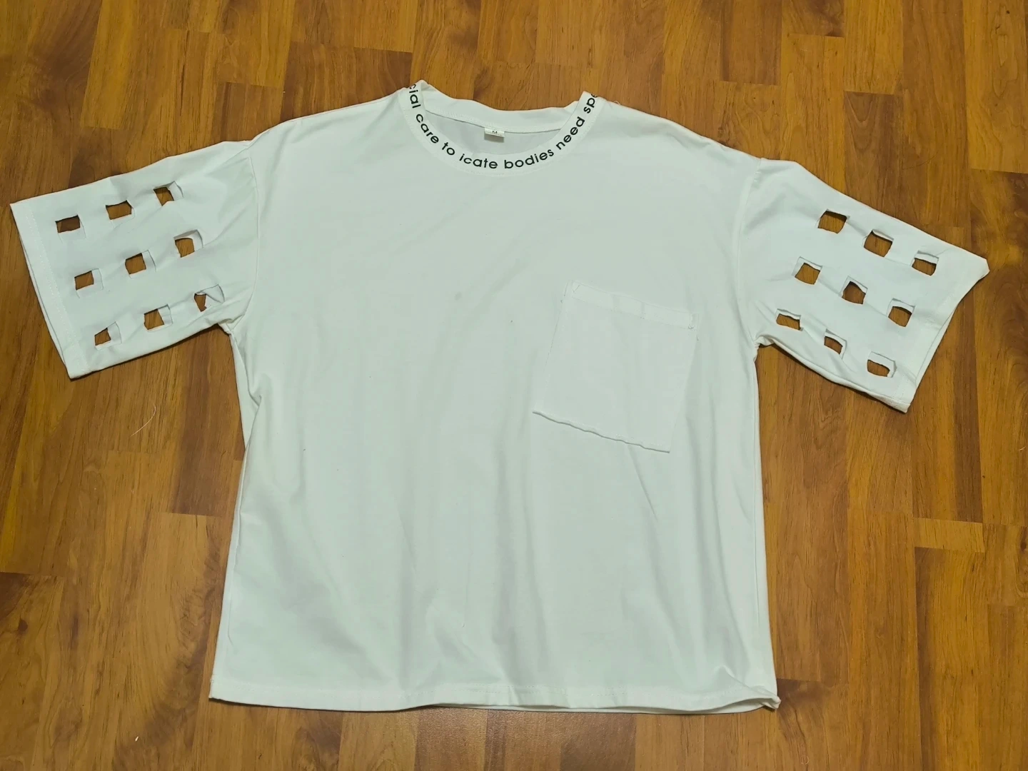 White crewneck t-shirt with unique cut-out details on the sleeves. Features a chest pocket and text around the neckline. Medium. Length 60 cm. Bust 50 cm.