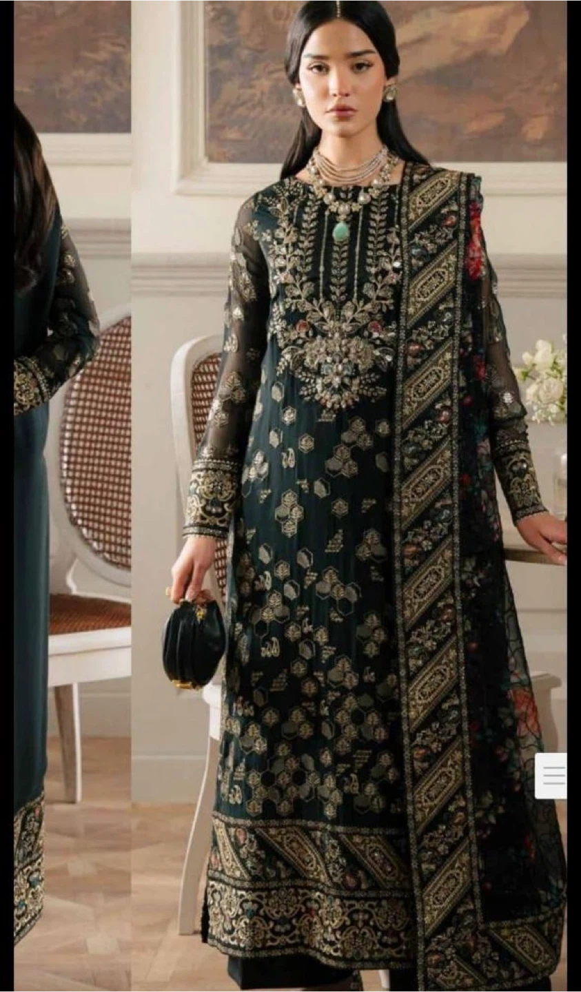 Beautifully embroidered dark green three-piece suit. It features intricate gold threadwork and a matching dupatta. This outfit is perfect for formal occasions.