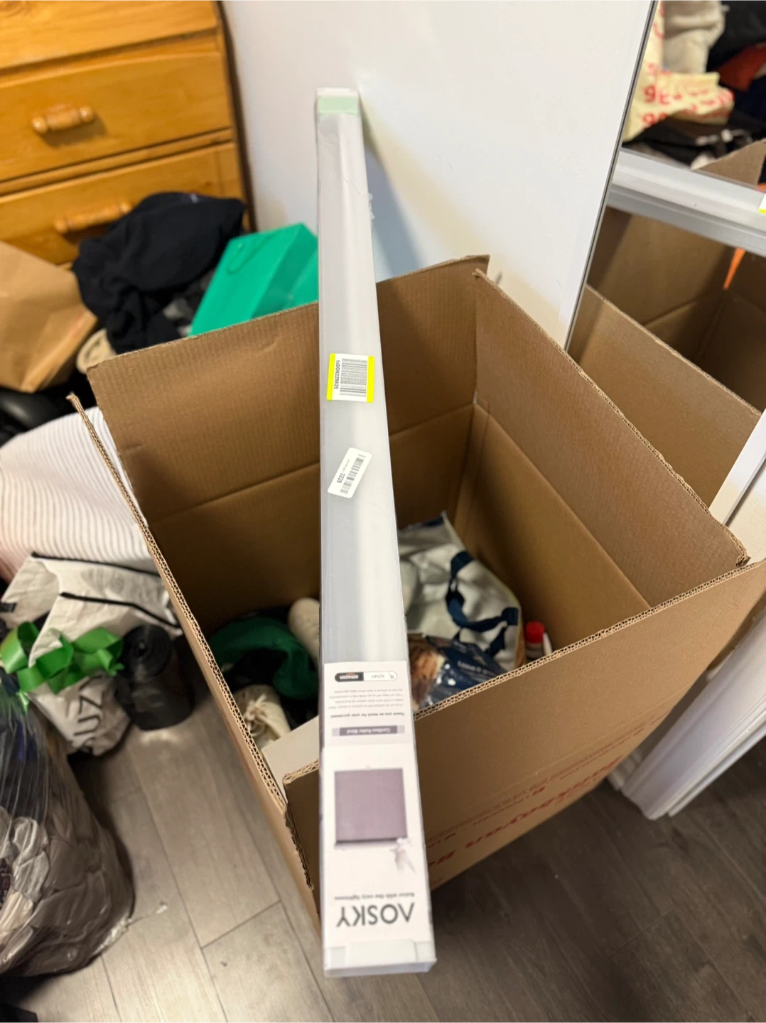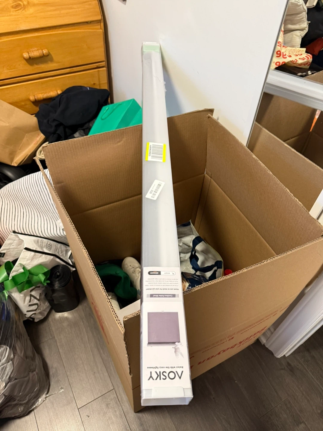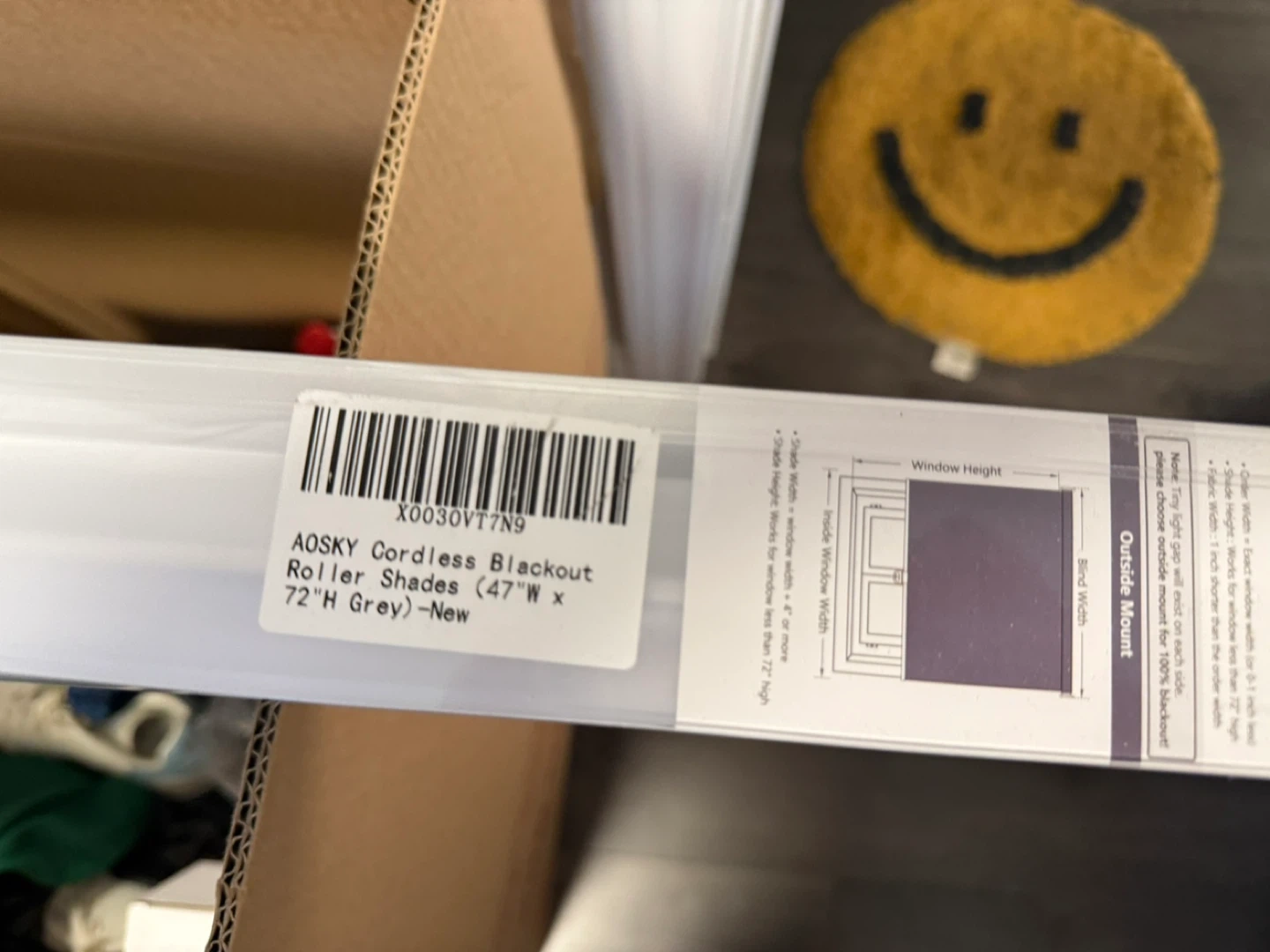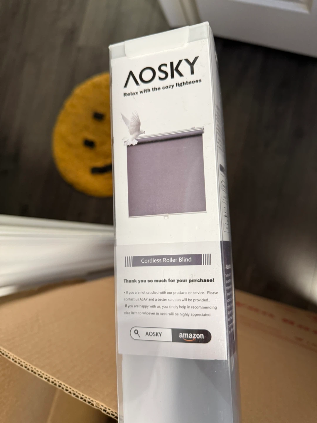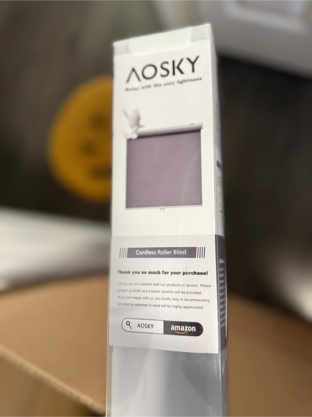 This is an AOSKY cordless roller blind. It's 47 inches wide by 72 inches high and comes in a grey colour. It's a blackout shade for light control. Useful for bedrooms or living spaces needing darkness!